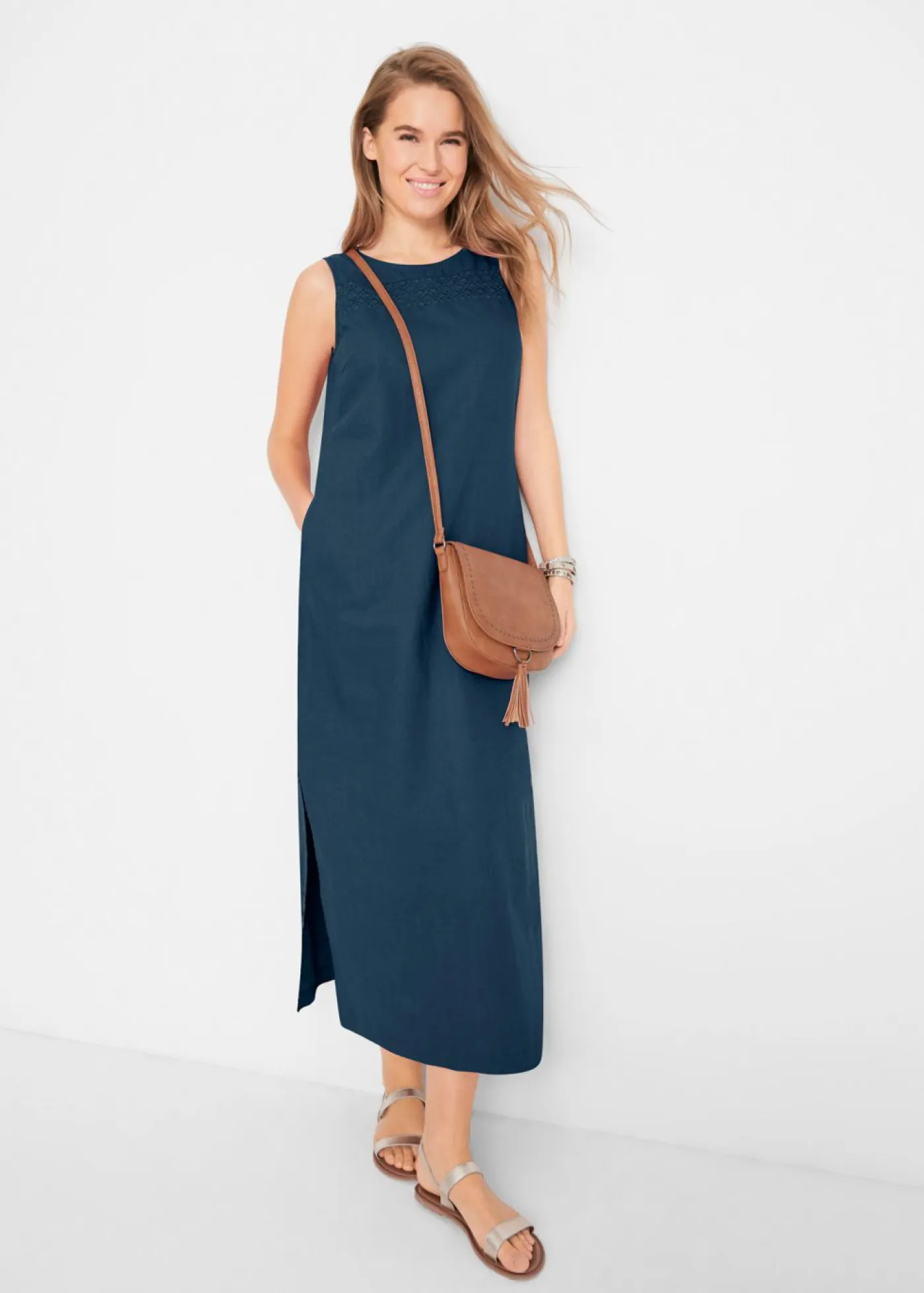 Cómodo vestido con patrón calado decorativo en el escote. Largo de aprox. 136 cm en todas las tallas. Se puede lavar a máquina.