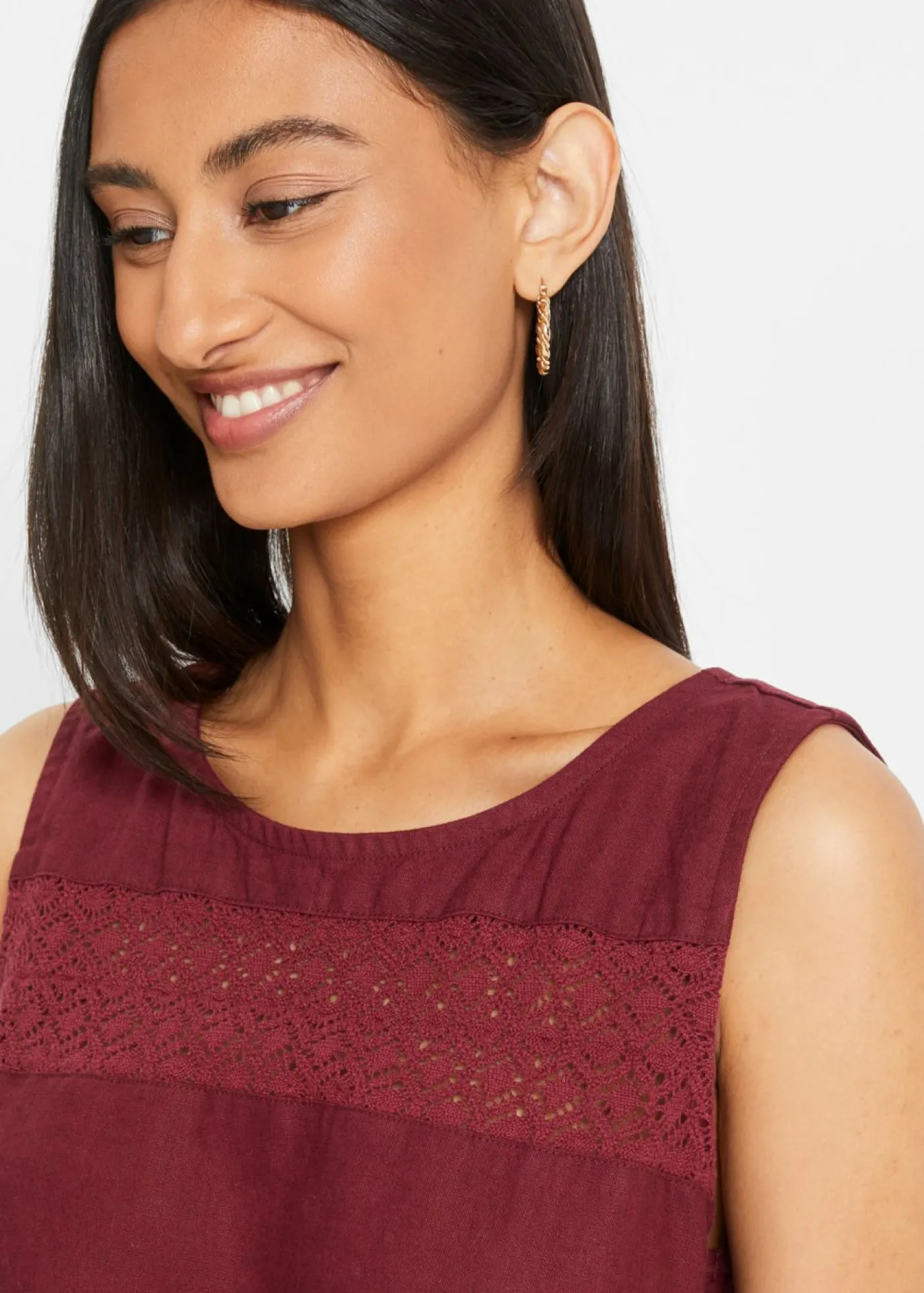 Vestido largo de lino con motivo perforado en el escote y abertura lateral
