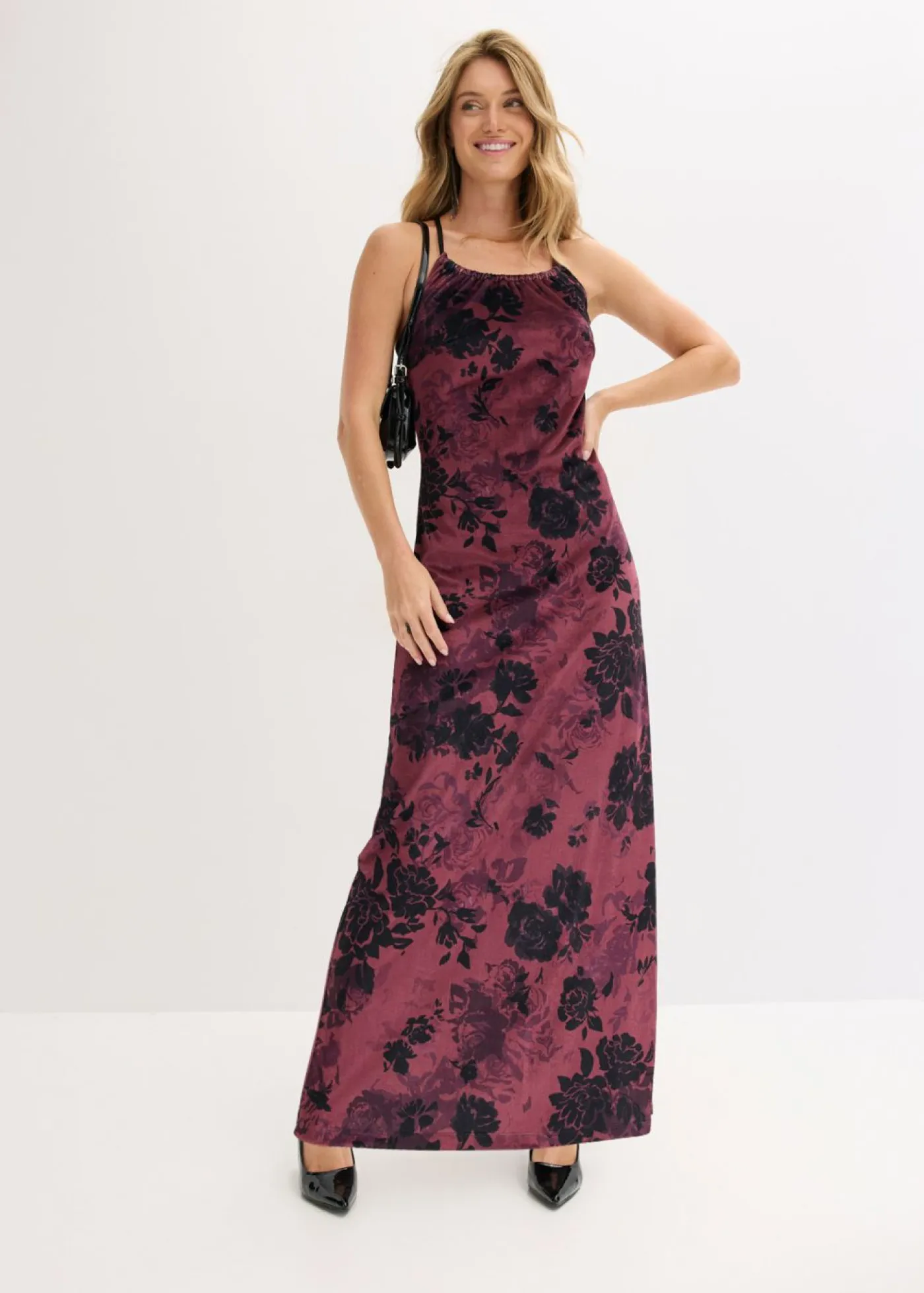 Moderno y femenino: vestido con tirantes de terciopelo brillante, largo maxi y tirantes cruzados en la espalda.