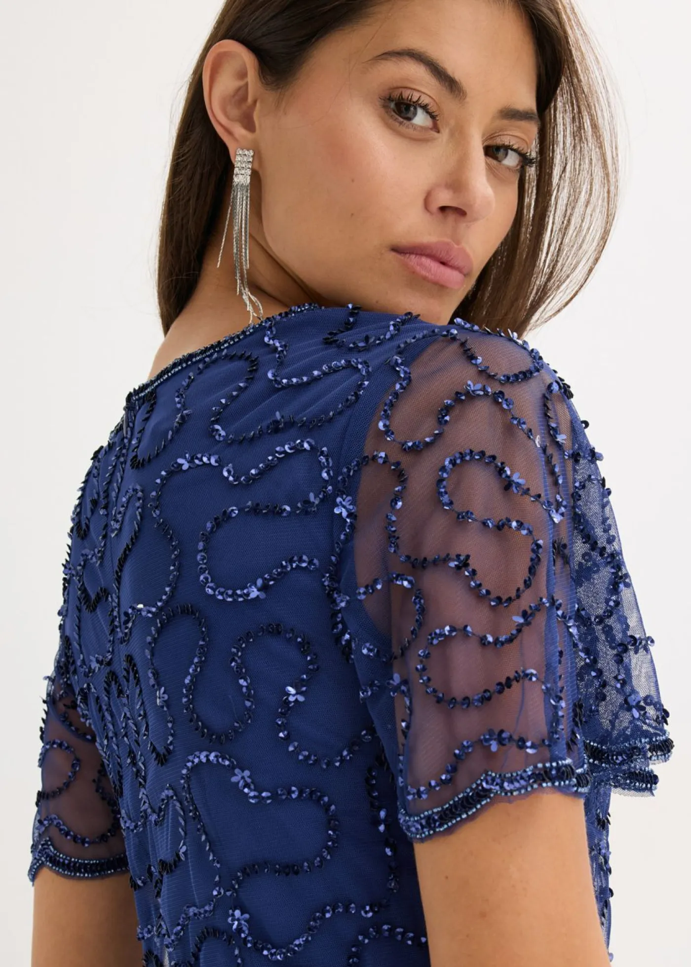 Elegante y femenino: Vestido de noche de tul fino con bordado de lentejuelas en el corpiño. El dobladillo festoneado de la parte superior y las mangas confieren al vestido una elegancia especial.