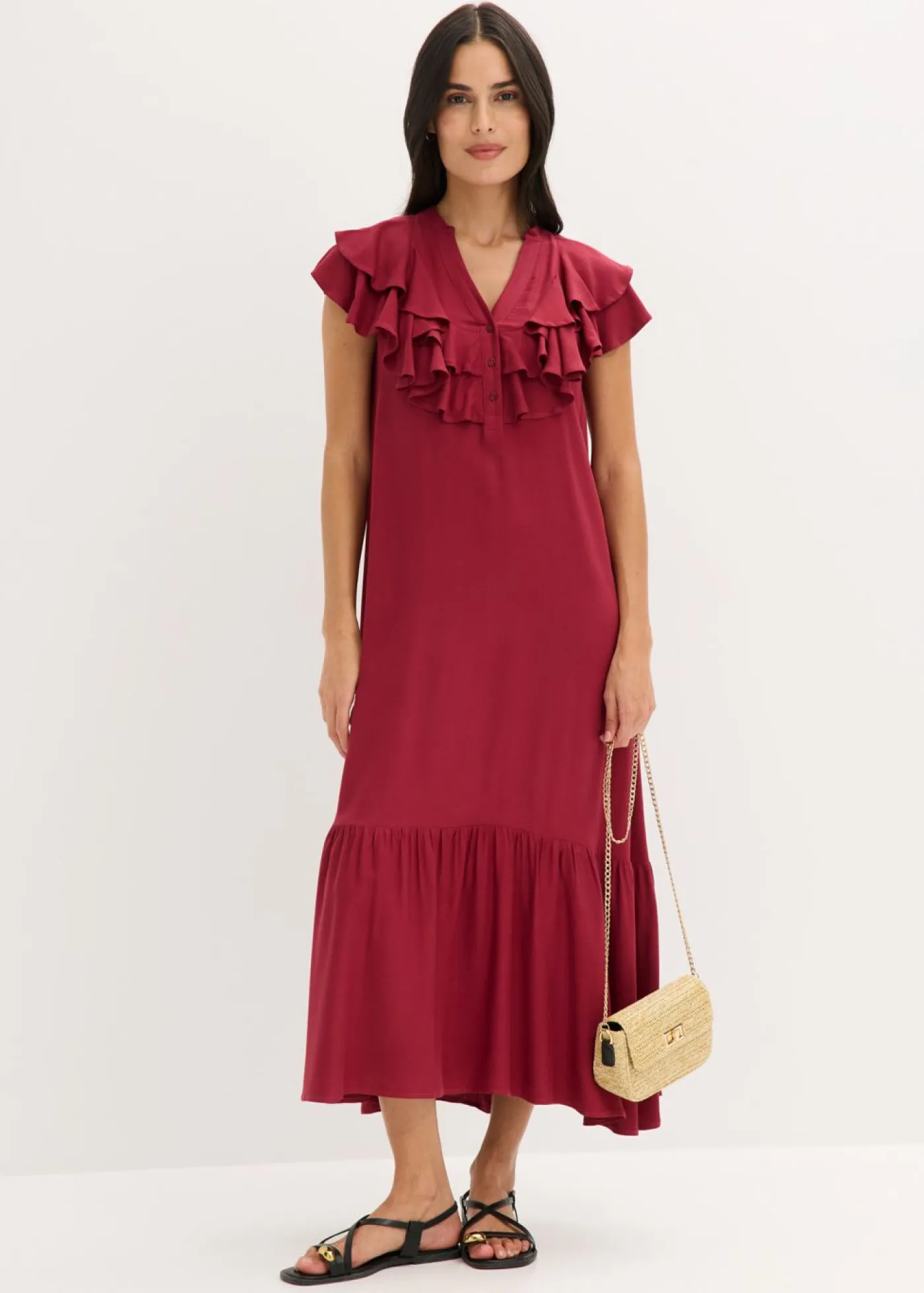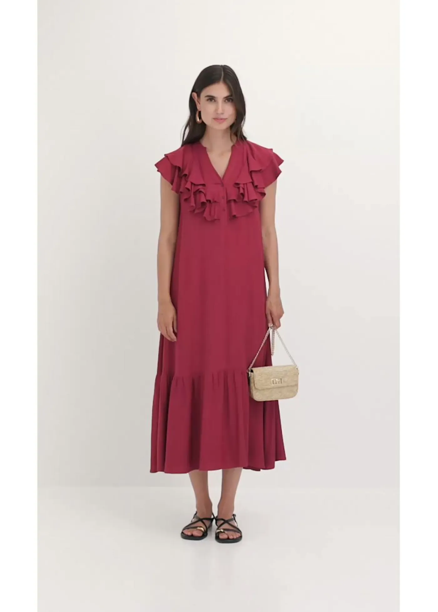 Vestido midi moderno de crepé estructurado con volantes.