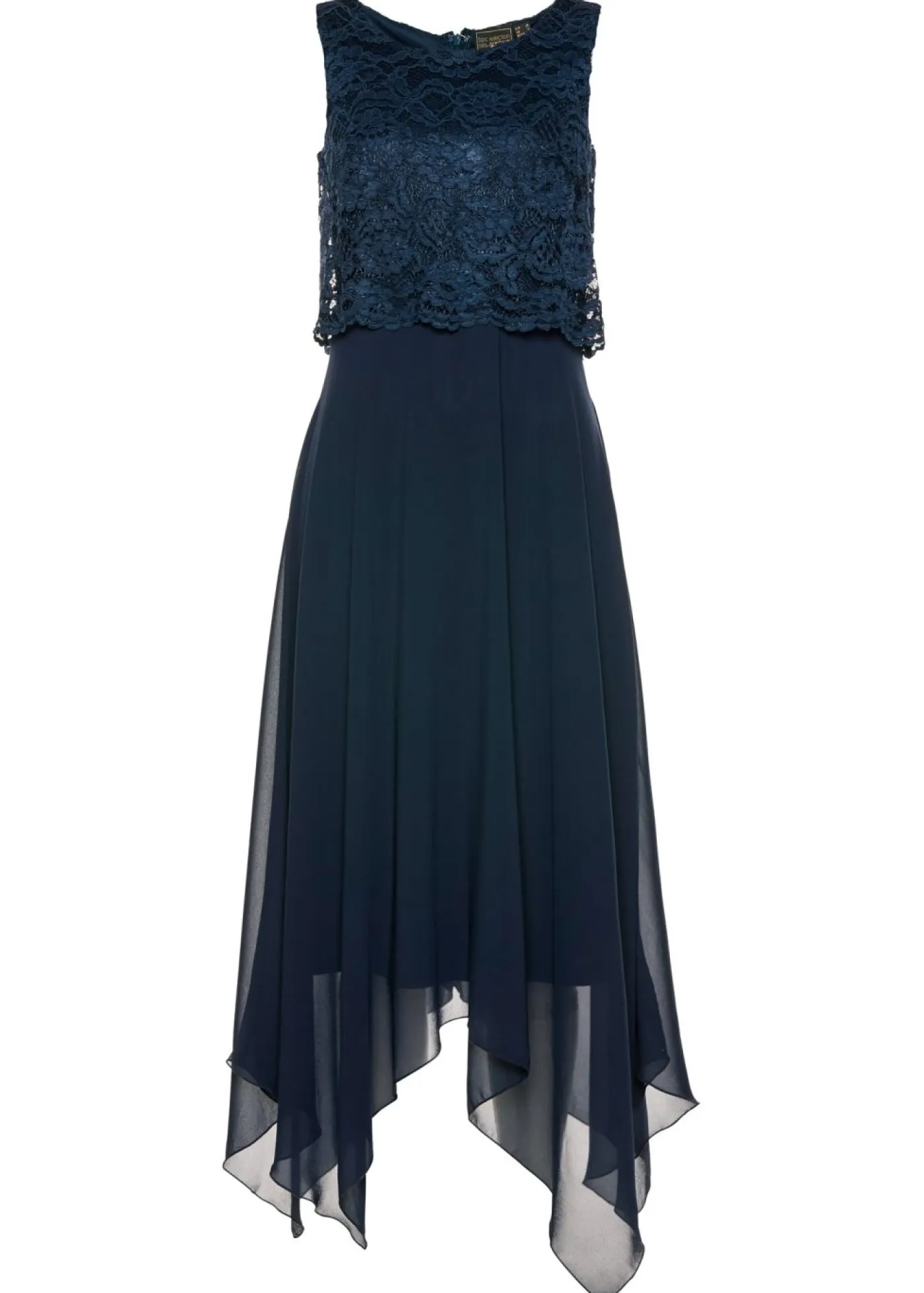 Elegante vestido de noche con encaje superior y falda asimétrica. Con encaje elegante y dobladillo irregular. Largo de aprox. 114 cm en todas las tallas. Se puede lavar a máquina.