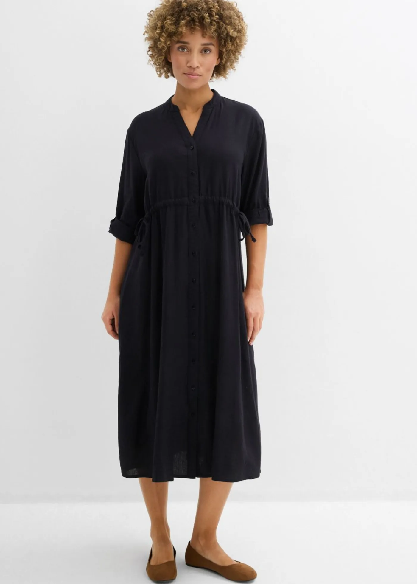 Vestido midi con mangas 3/4 y cordón ajustable en la cintura. Largo de aprox. 120 cm en talla 42. Se puede lavar a máquina.