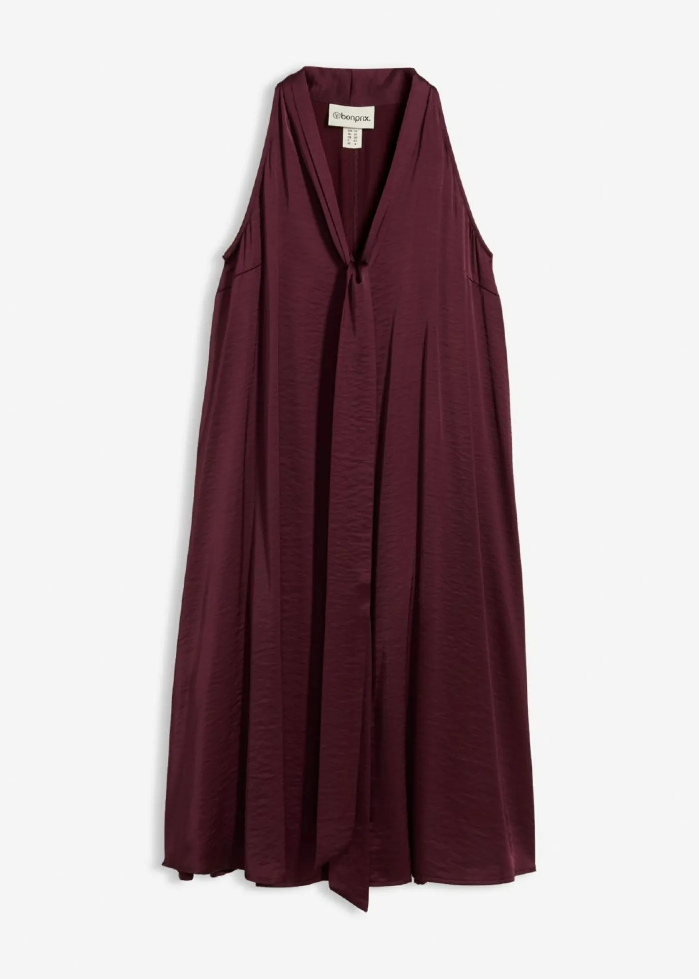 Vestido midi acampanado de satén fluido con cuello halter y detalle de chal.