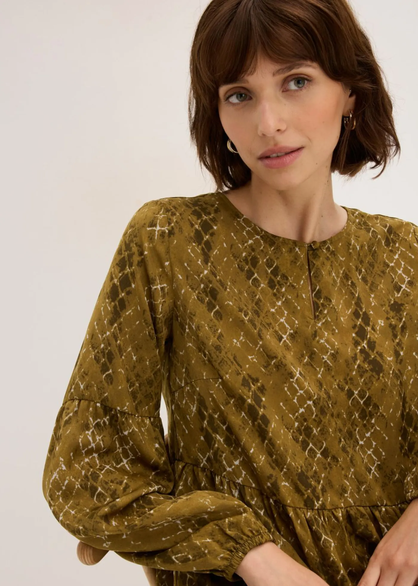 Vestido de satén con mangas voluminosas y cintura entallada.