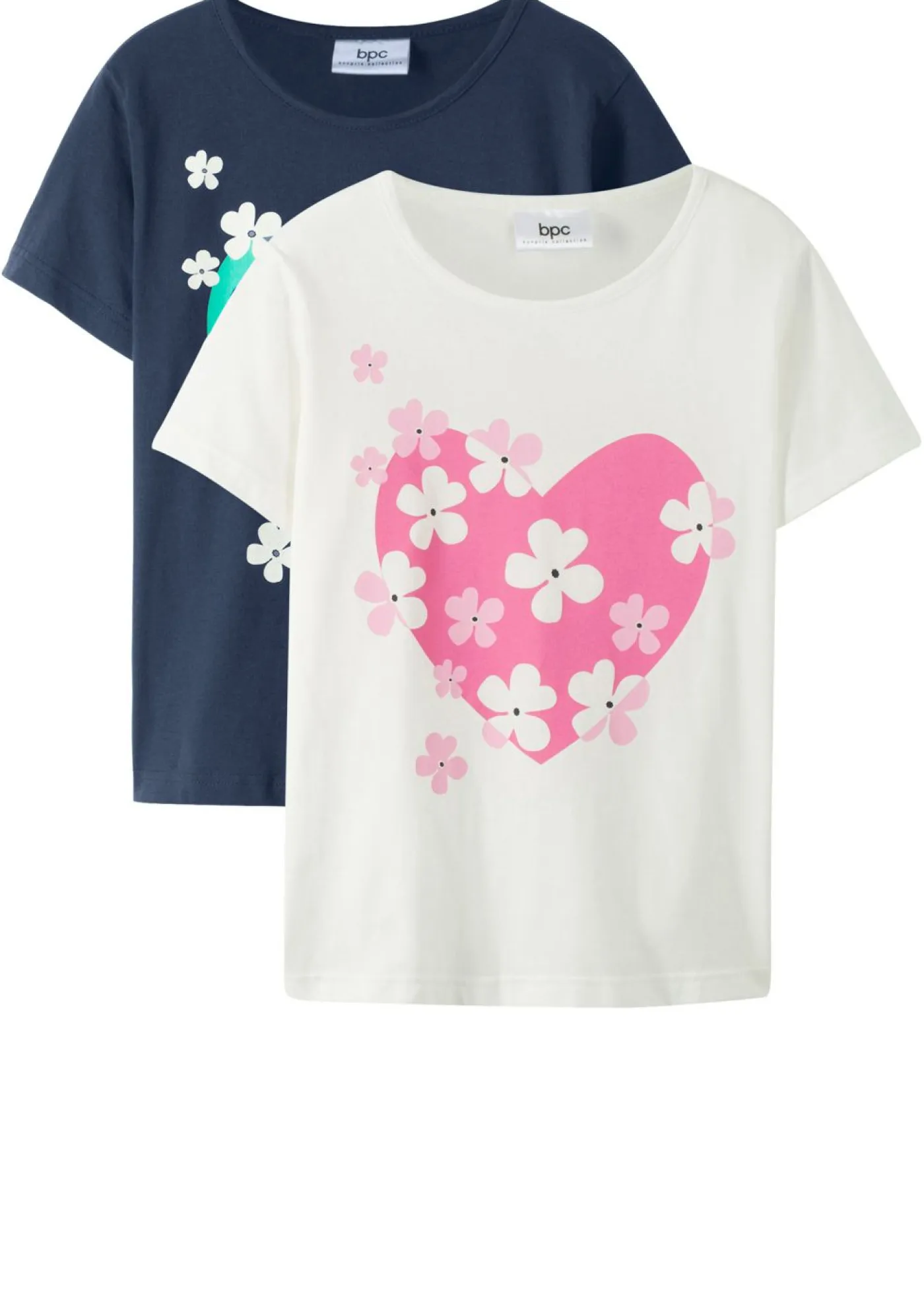 Conjunto doble de camisetas con estampado romántico para niñas. Fantástico conjunto de dos camisetas estampadas para niñas. El estampado con corazones y flores es particularmente romántico.
