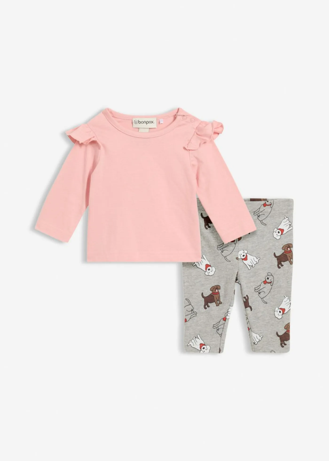 Camiseta monocolor de manga larga con volantes en los hombros y leggings con un bonito estampado de perros y cinturilla elástica. Conjunto de punto compuesto por camiseta de manga larga y leggings. Camiseta con botones a presión en un hombro para ponerla cómodamente. Leggings con cintura elástica y estampado integral de perros.