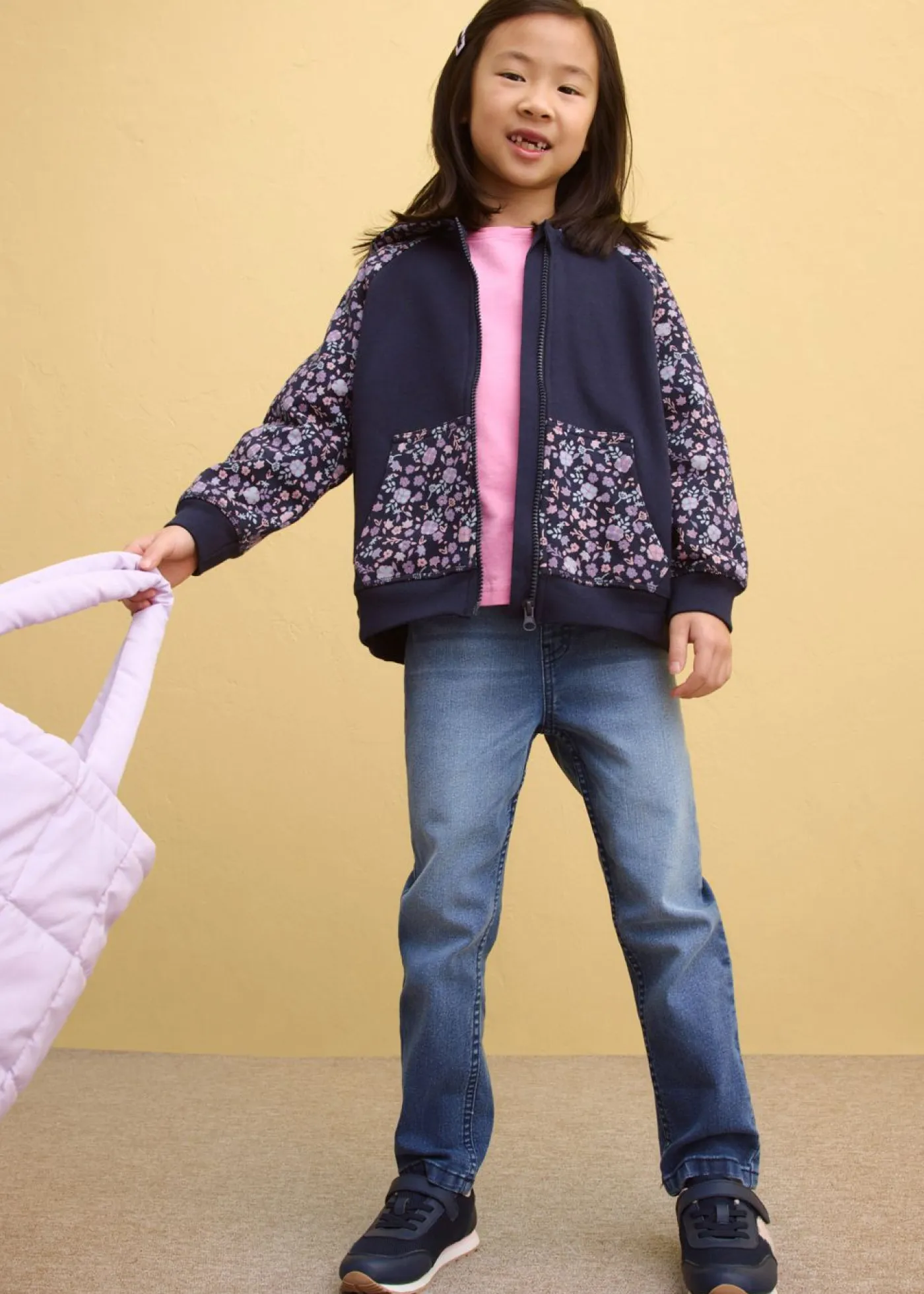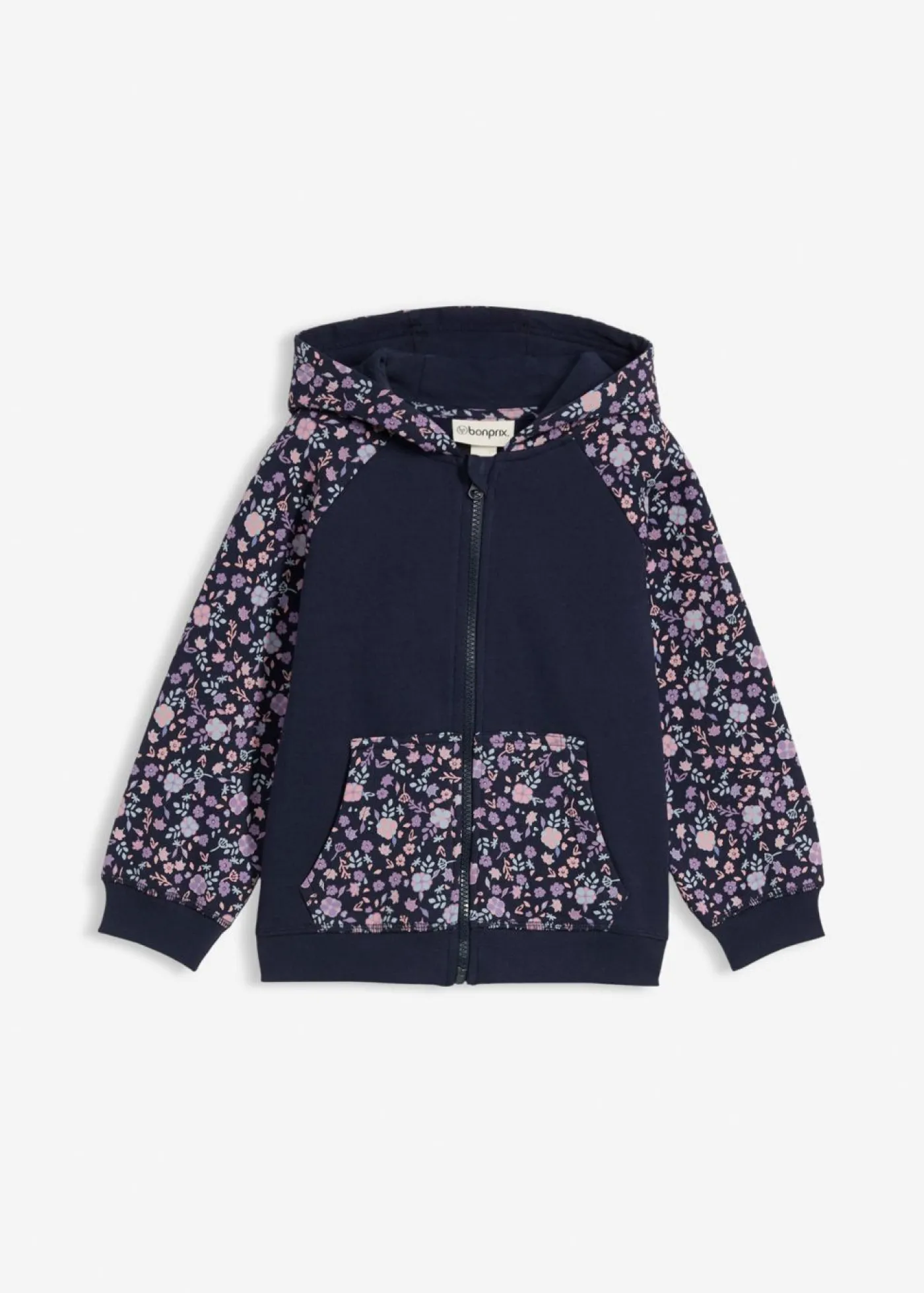 Chaqueta holgada de chándal con estampado integral, bolsillo tipo canguro y práctica cremallera.
