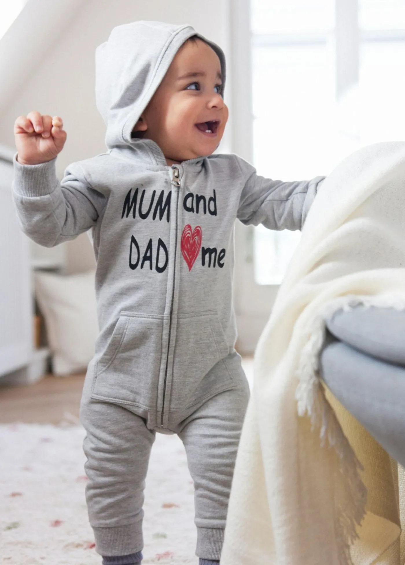 Mono de chándal de mezcla de algodón con capucha para bebés. Bonito mono para bebés de suave de chándal con capucha y bolsillos tipo canguro. El estampado «Mum and Dad love me» atrae todas las miradas. Los suaves puños de canalé y el corte cómodo garantizan que tu bebé se sentirá muy a gusto.