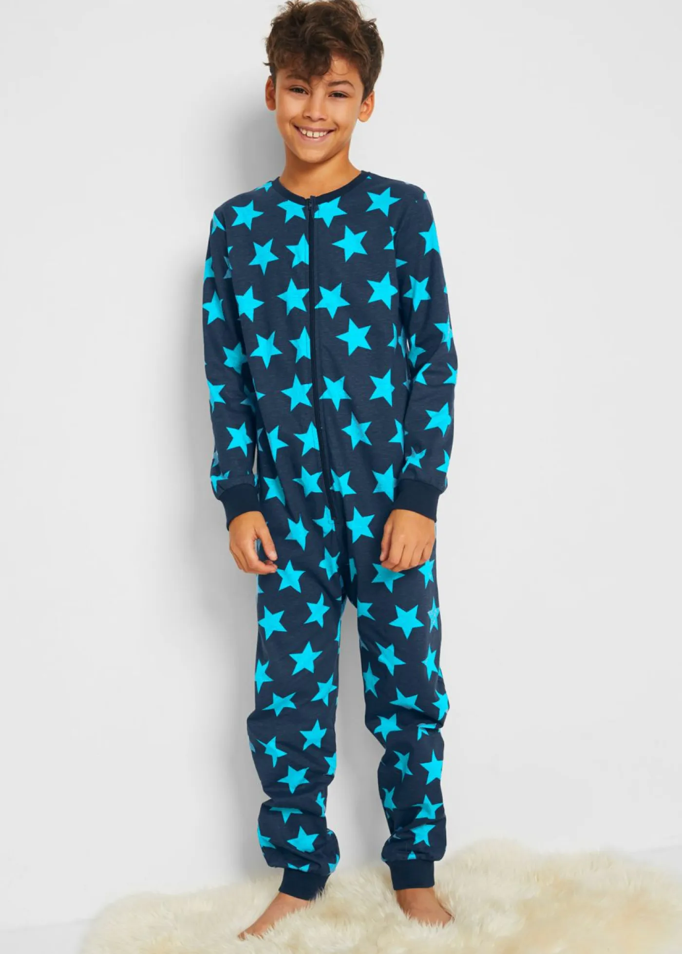 Moderno mono para dormir con estampado de estrellas y algodón orgánico. Imprescindible para el invierno: este mono para dormir con estampado integral de estrellas. Los puños anchos en las mangas, los bajos de las piernas y el cuello, así como la suave calidad del algodón, garantizan una gran comodidad. La cremallera con protección para la barbilla en la parte delantera permite ponérselo fácilmente.