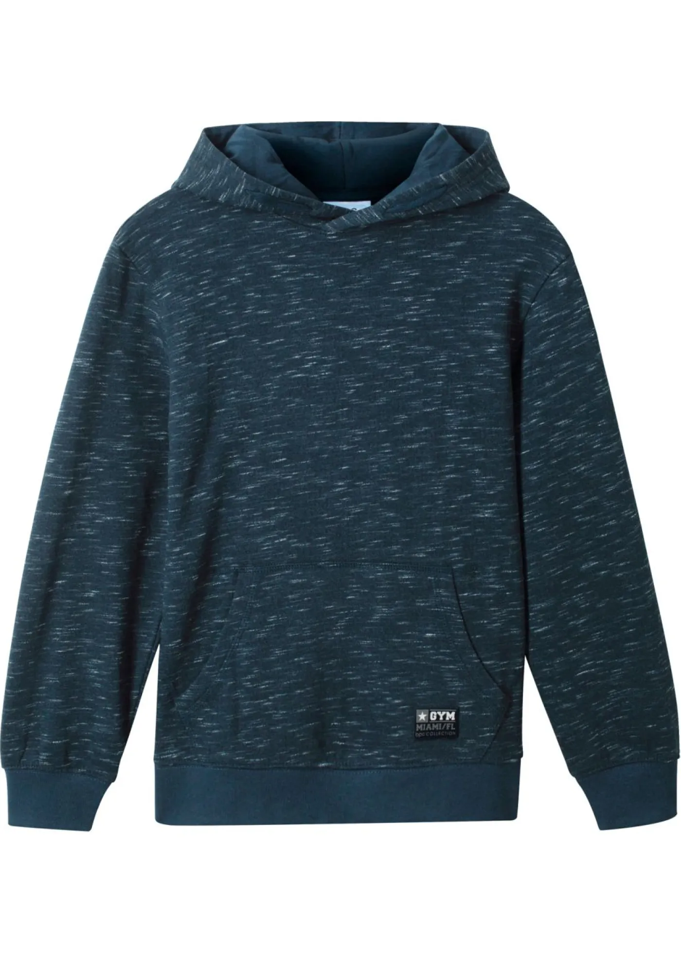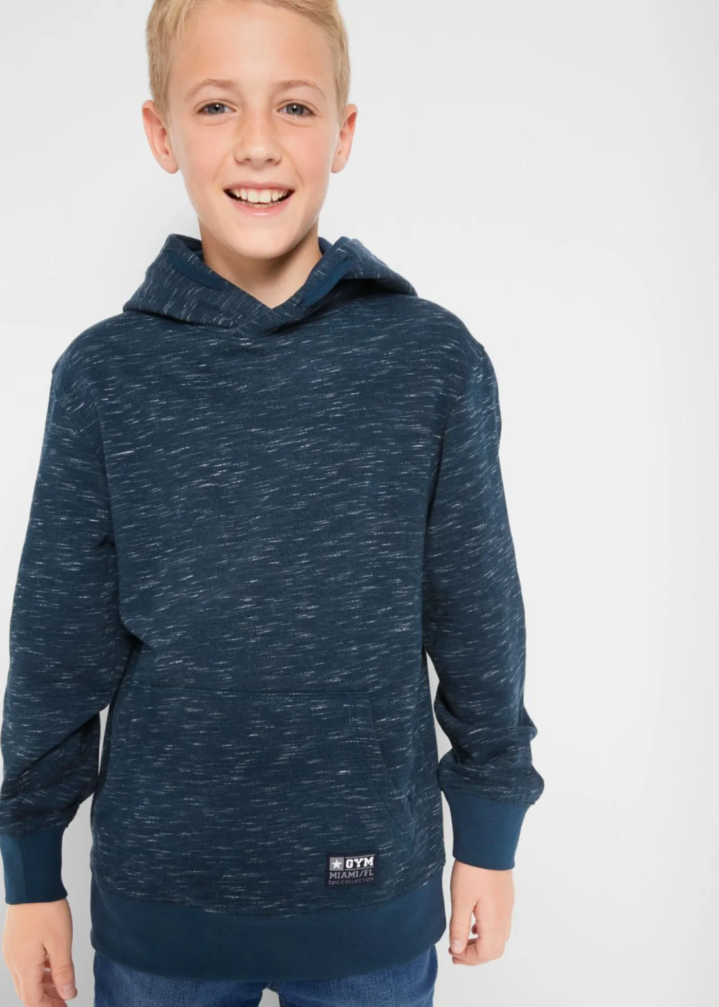 Sudadera deportiva con capucha para niños. Moderna sudadera de capucha con aspecto jaspeado. Su diseño la convierte en una prenda muy fácil de combinar. Además, al ser holgada, resulta muy cómoda. La sudadera queda muy bien con pantalón vaquero o chino, y es perfecta para llevar a clase o disfrutar del tiempo libre.