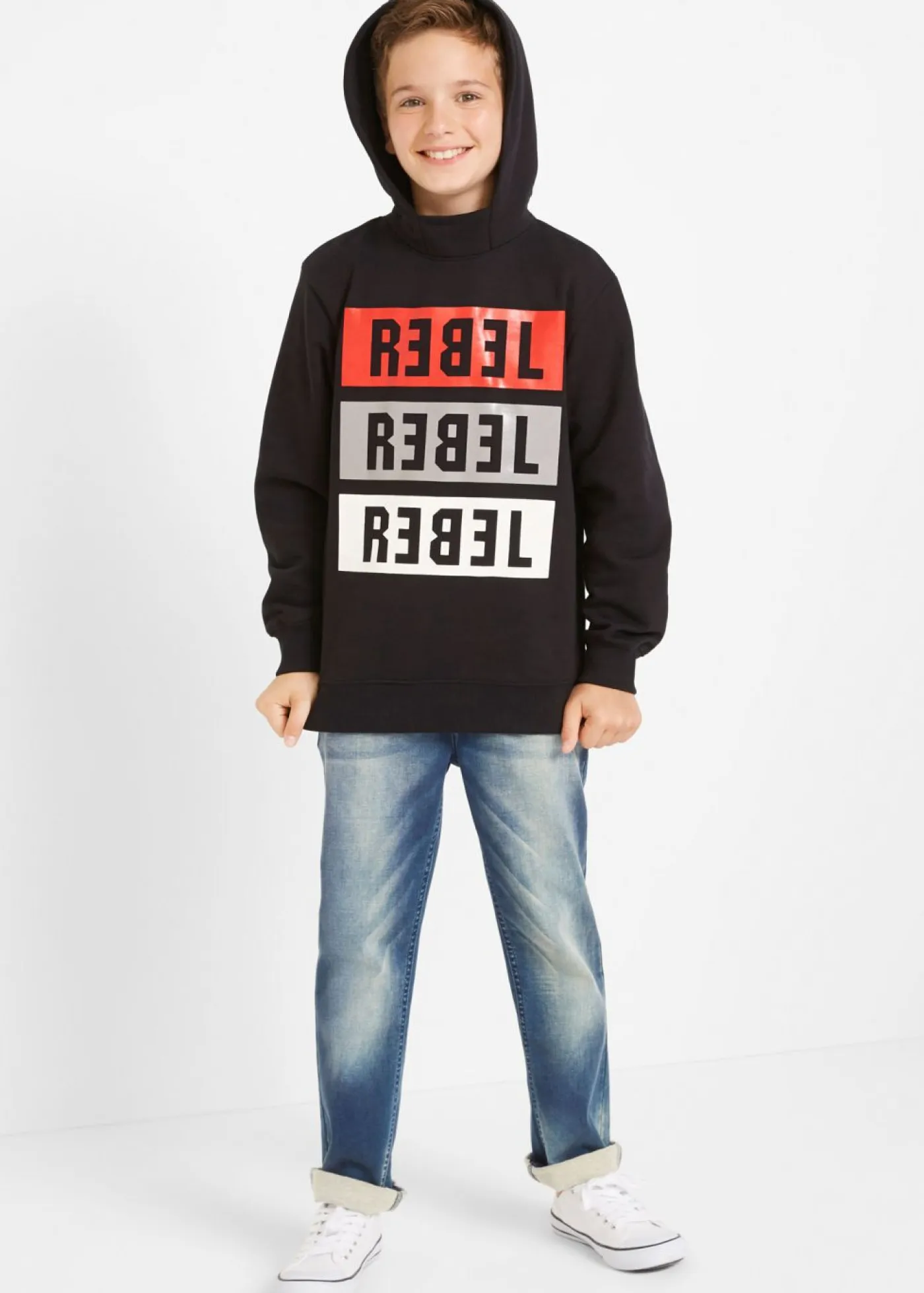 Vaqueros tipo chándal con cordón para niños. A primera vista, lo que parecen vaqueros son en realidad unos deportivos. Pantalón de corte recto con aspecto vaquero estampado, dobladillo elástico y cordón de color en contraste.