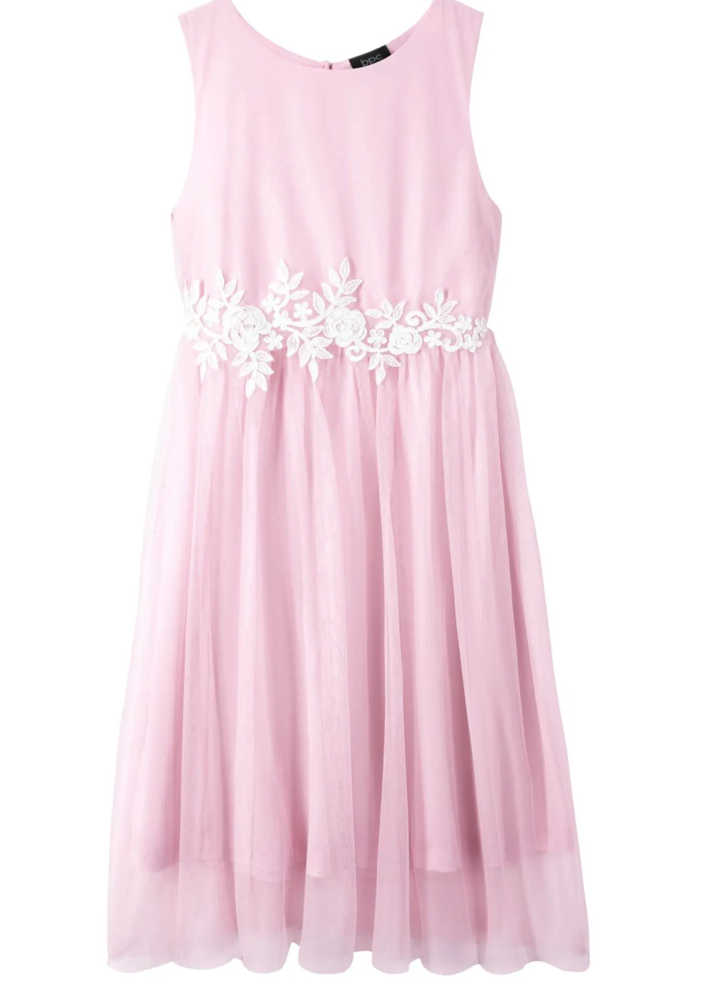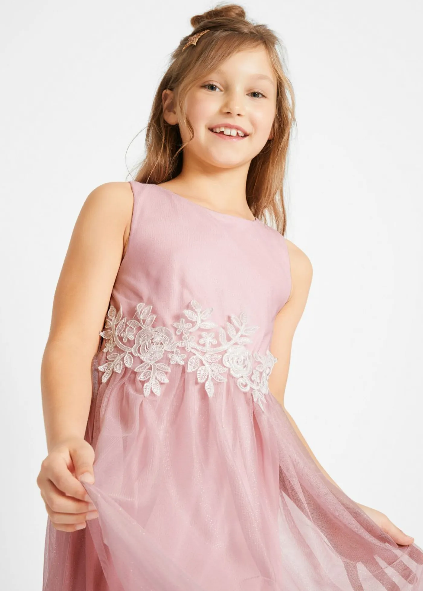 Vestido de fiesta con ribete de encaje para niñas. Vestido sin mangas con bonita inserción de encaje en la cintura.Discreto aspecto brillante en la falda.