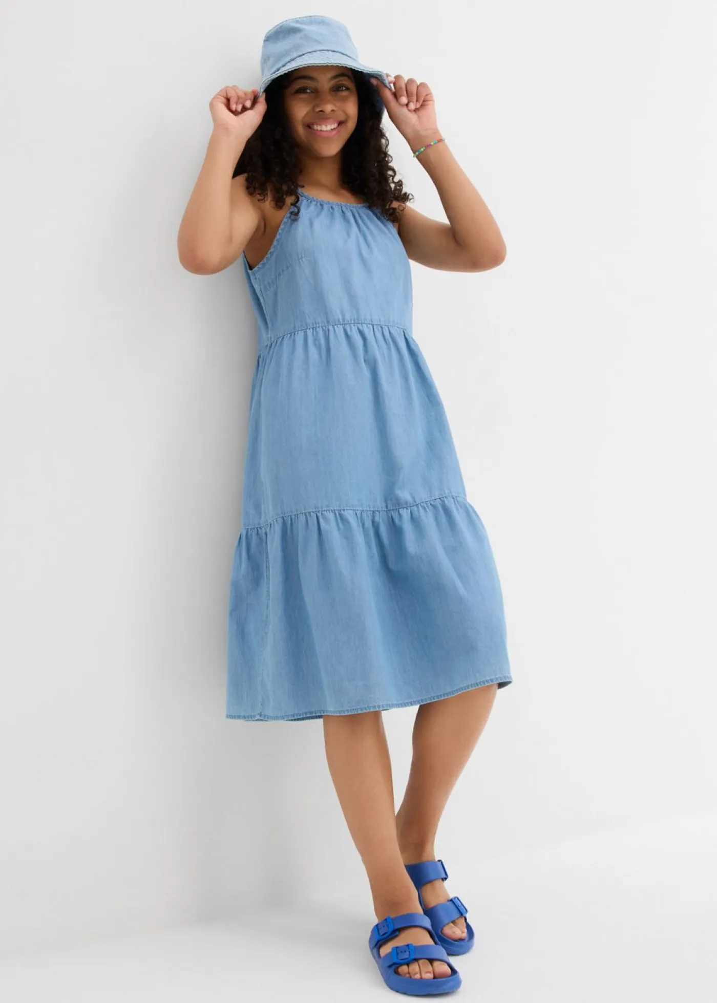 Divertido vestido vaquero de algodón orgánico puro con fruncidos.