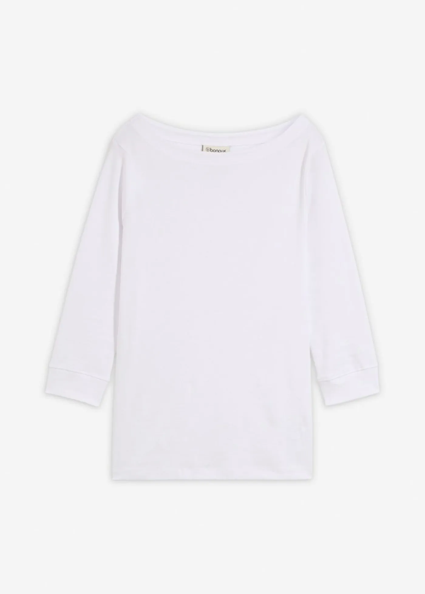 Cómoda camiseta elástica con mangas 374 y escote en U. Largo de aprox. 64 cm (talla 36/38) a aprox. 72 cm (talla 52/54). Se puede lavar a máquina.