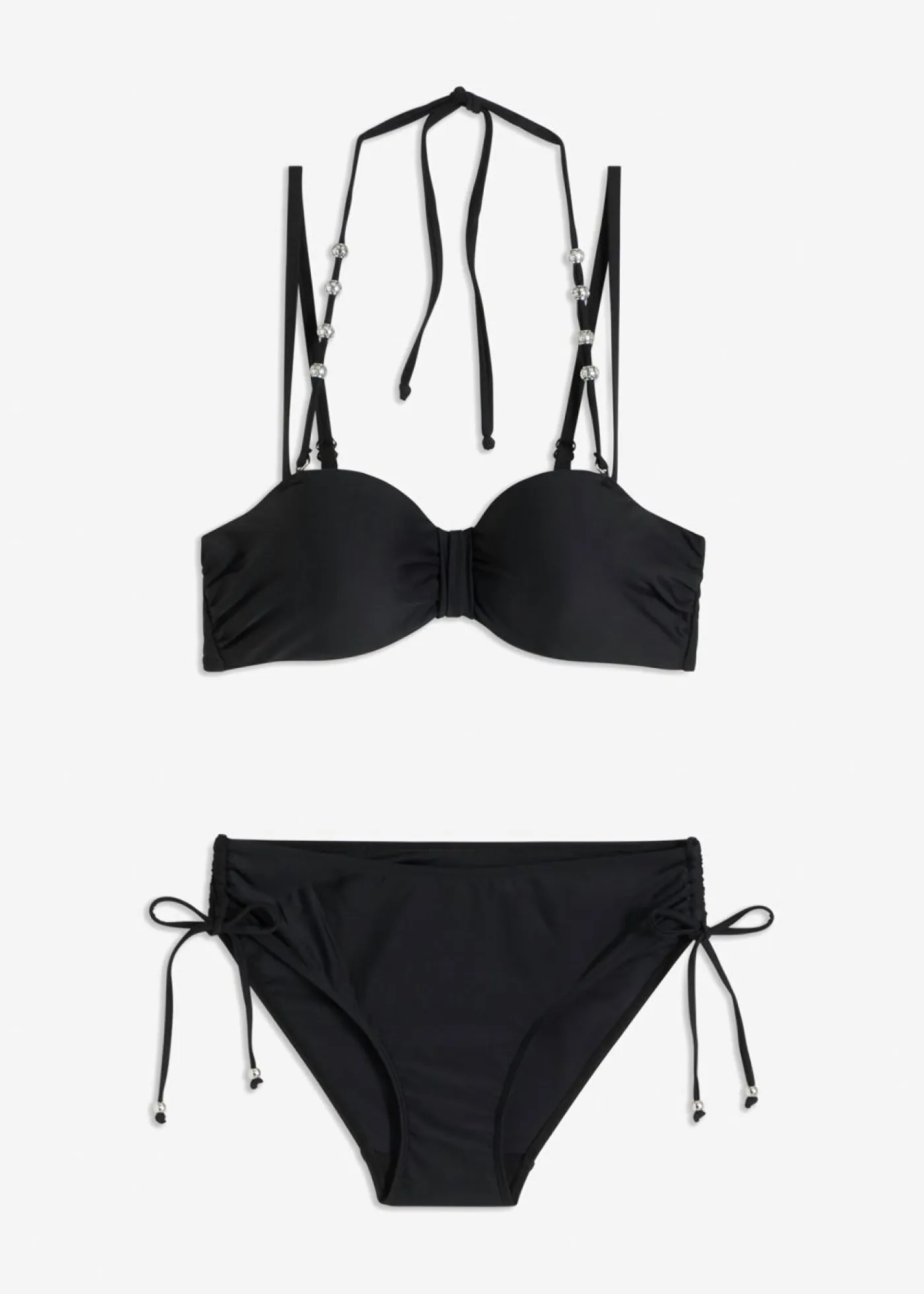 Bikini balconette con tirantes halter desmontables. Con tirantes ajustables y dos tirantes al cuello desmontables. Con copas preformadas. Cierre de clic en la espalda.