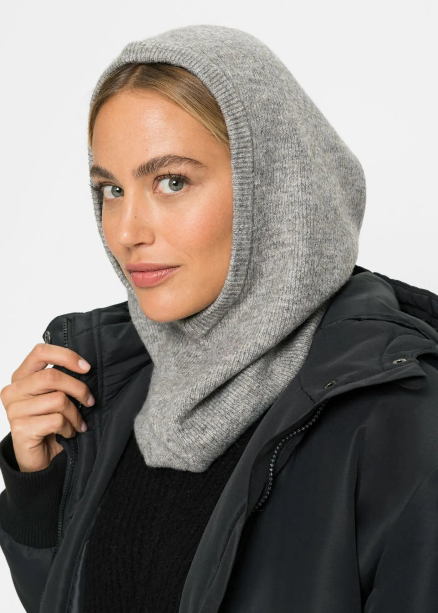Elegante capucha de punto con diseño sencillo. La suave capucha de punto te mantiene abrigada. Tiene una altura de aprox. 55 cm.