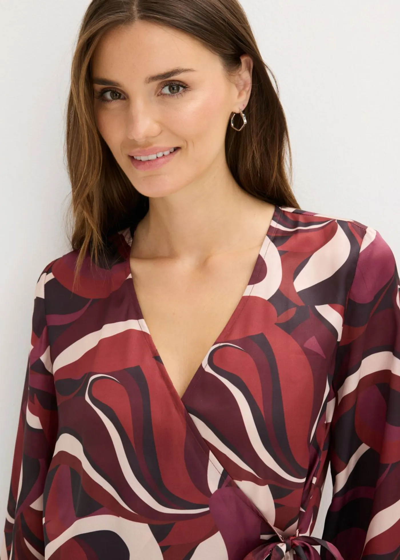 Blusa de satén vaporoso con estampado de moda y cierre de lazo en el interior y el exterior.