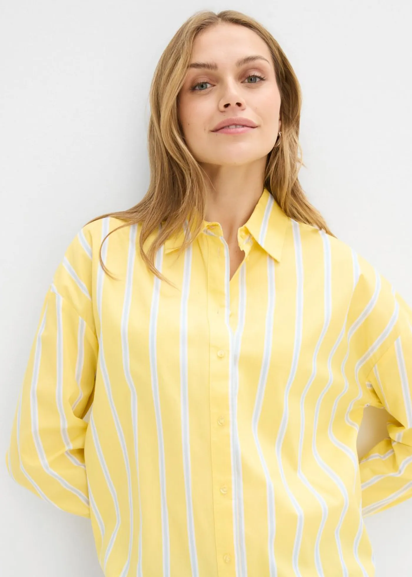 Blusa oversize de manga larga, con botones y cuello clásico. Con detalle ajustable en la espalda para regular el ancho. Largo de aprox. 56 cm en talla 42. Se puede lavar a máquina.