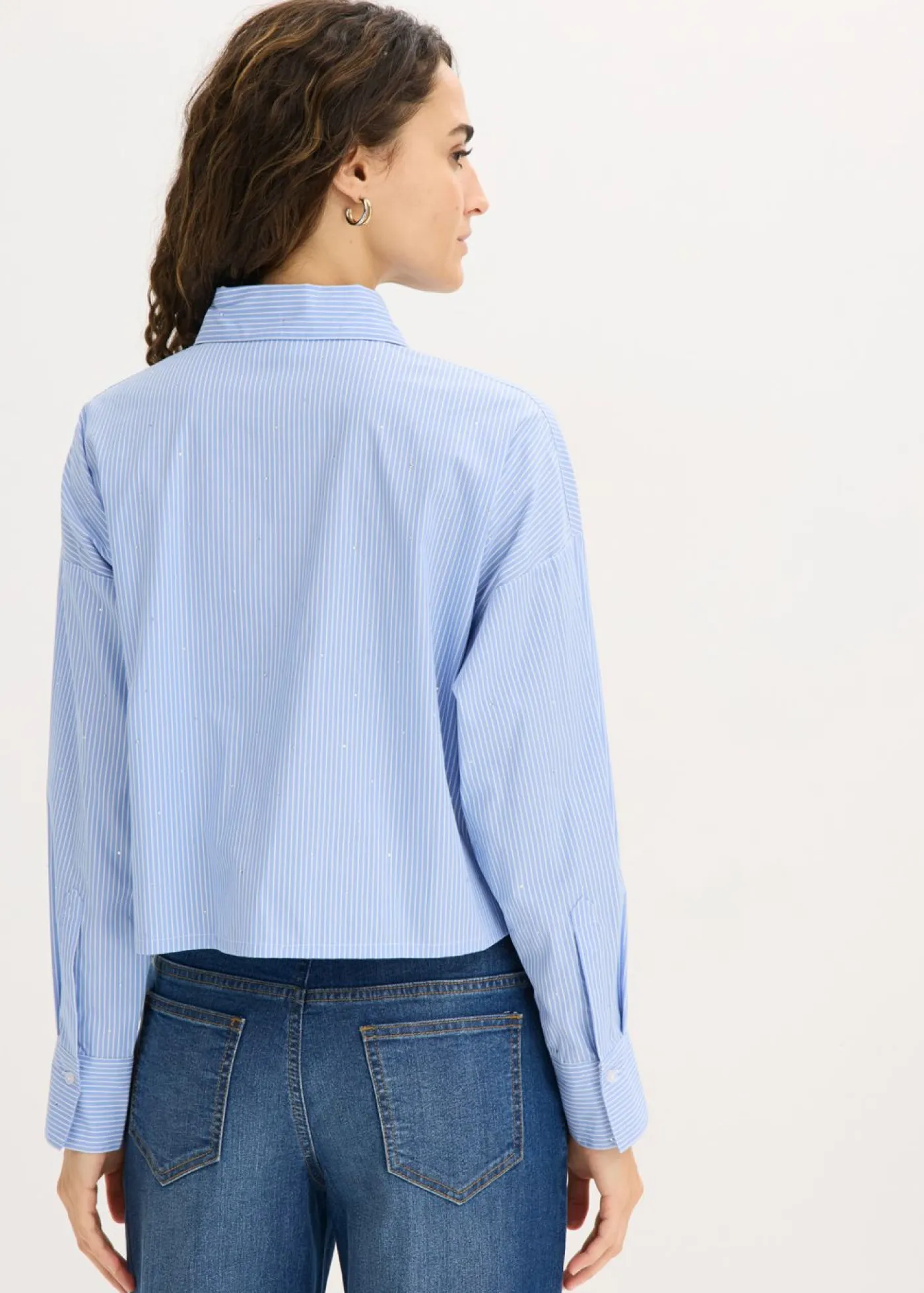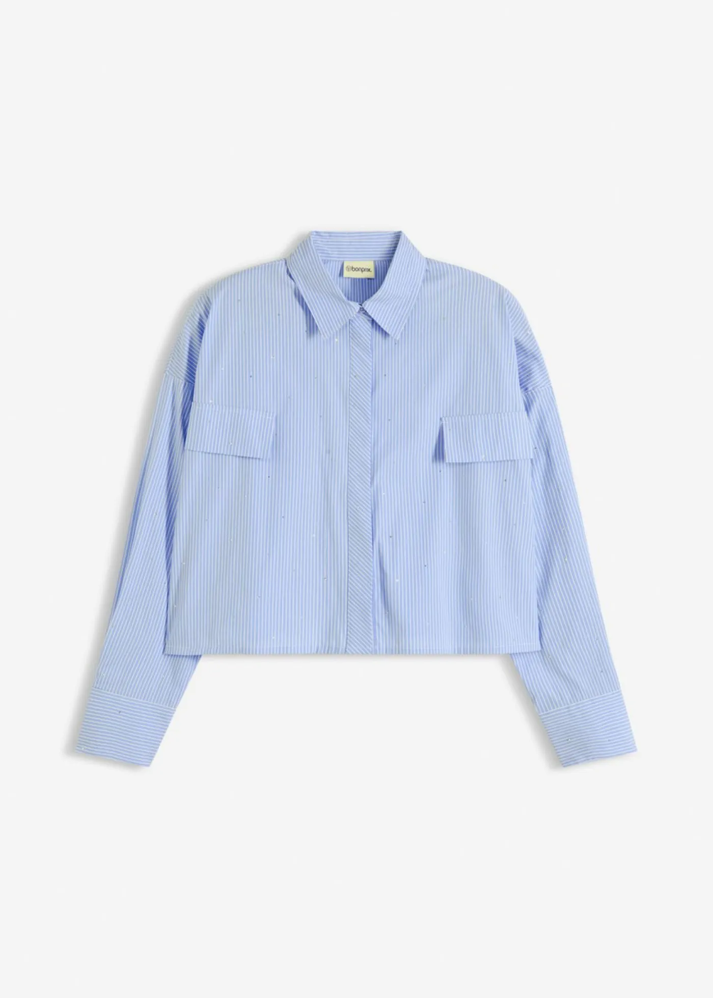 Blusa corta con diseño de rayas y solapas superpuestas.