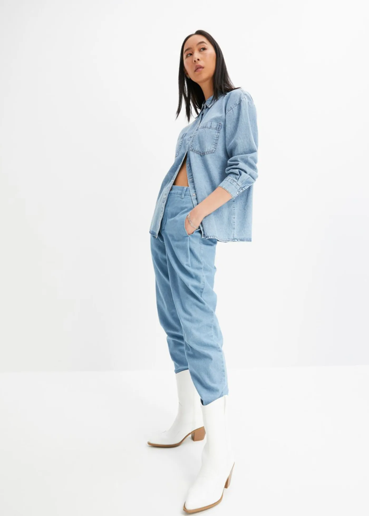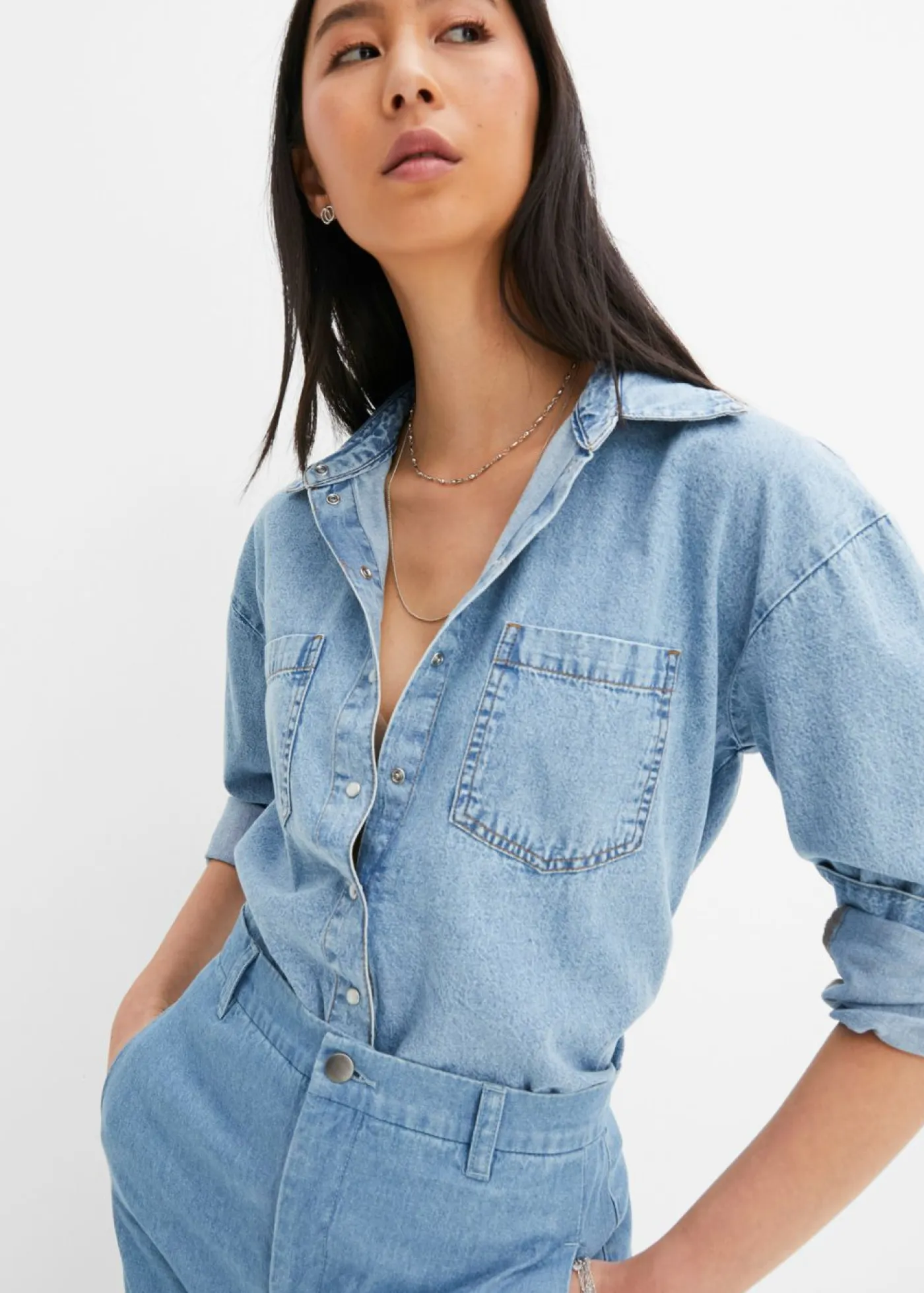 Camisa vaquera holgada con bolsillos y cuello tipo Kent. Largo total de aprox. 68 cm en talla 42. Se puede lavar a máquina.