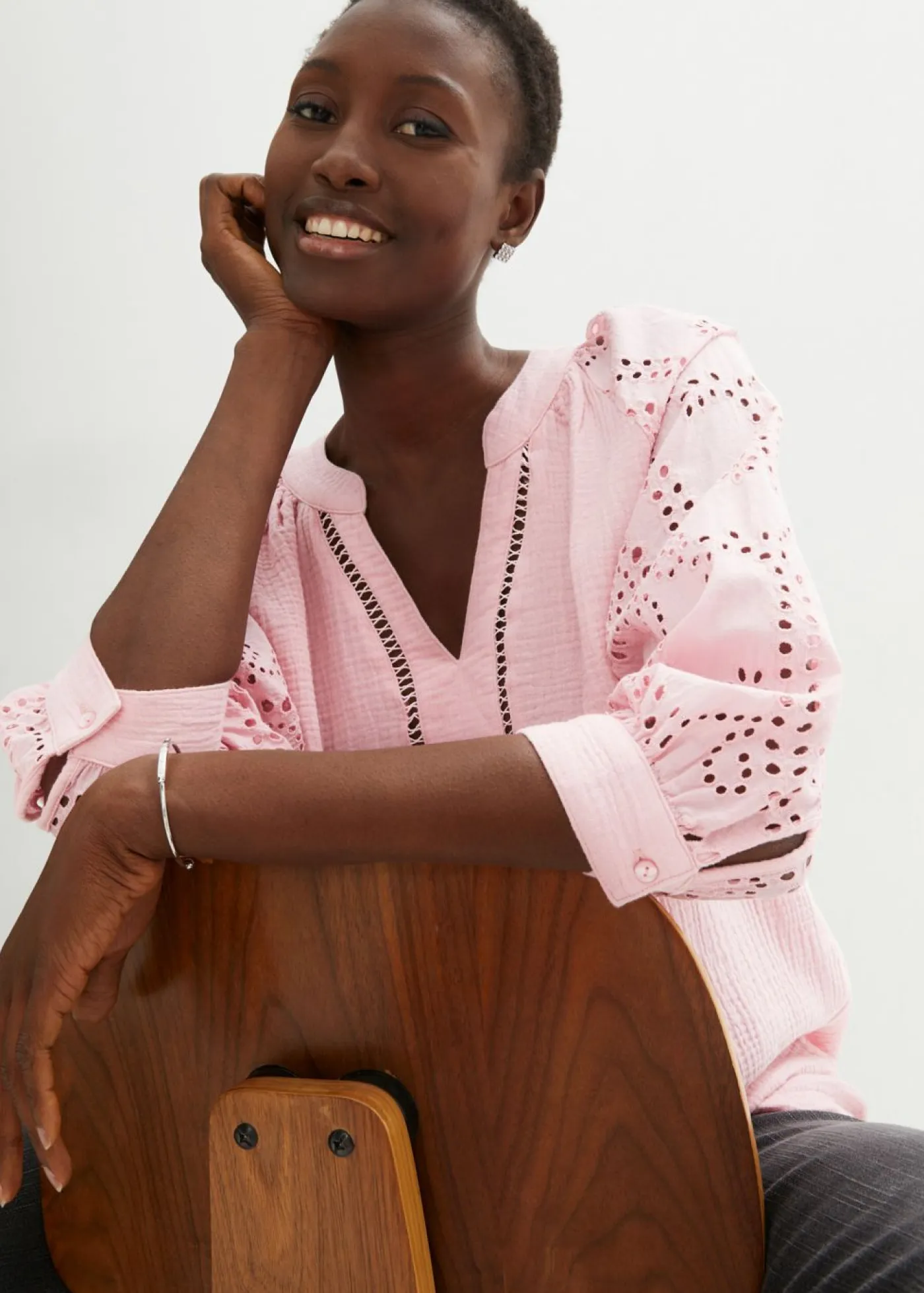 Bonita túnica de muselina con moderno bordado perforado.