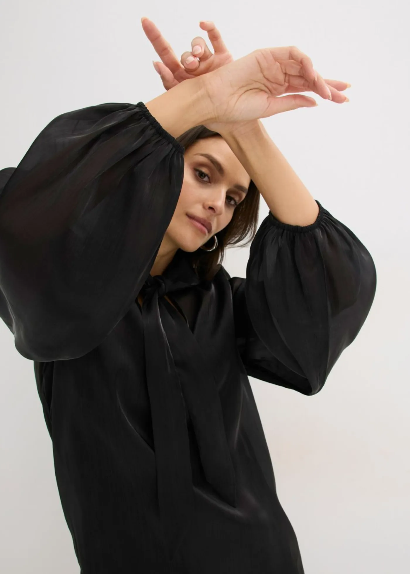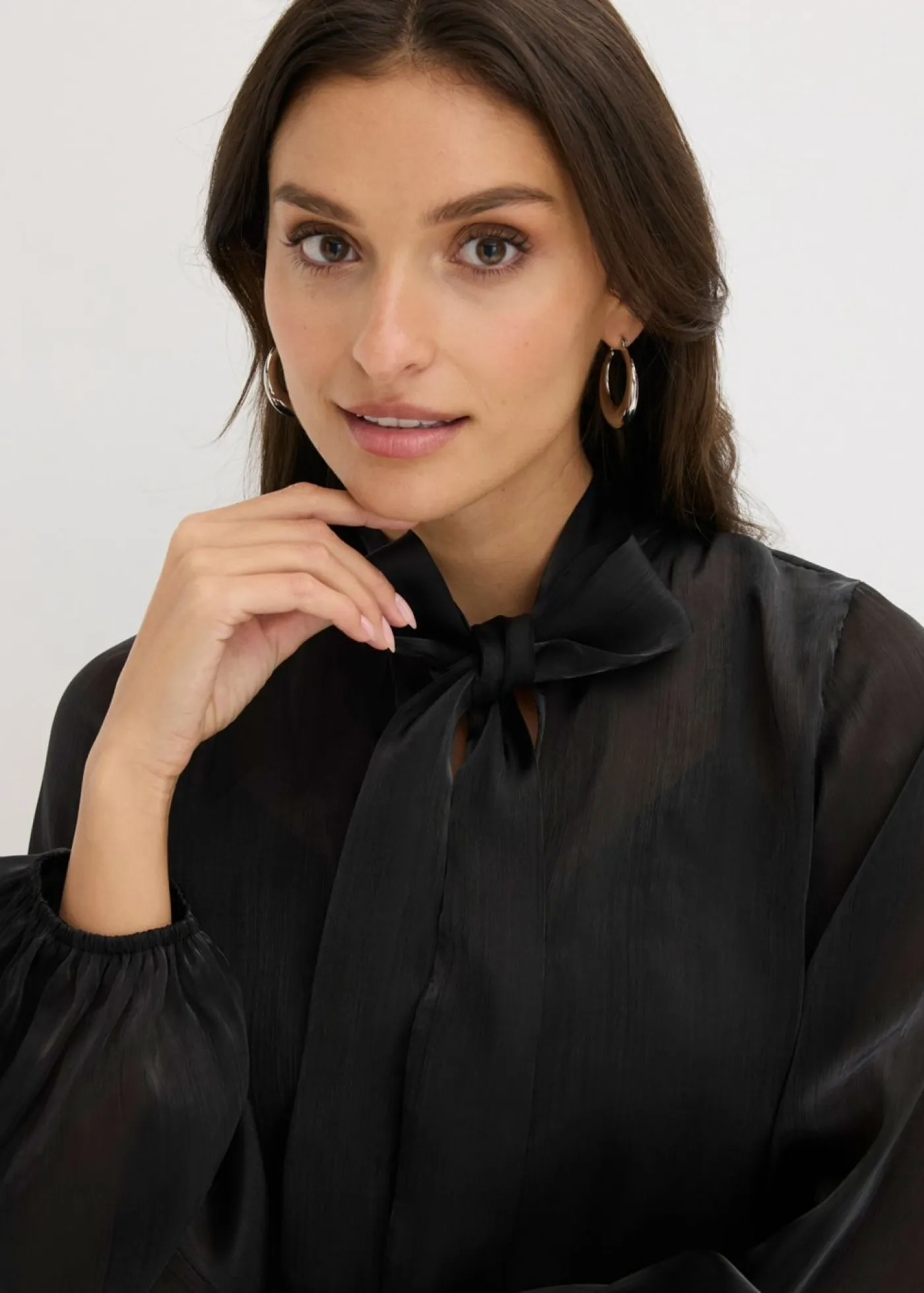Moderno y femenino: Blusa con lazo de tul brillante con detalle de lazo en el cuello.