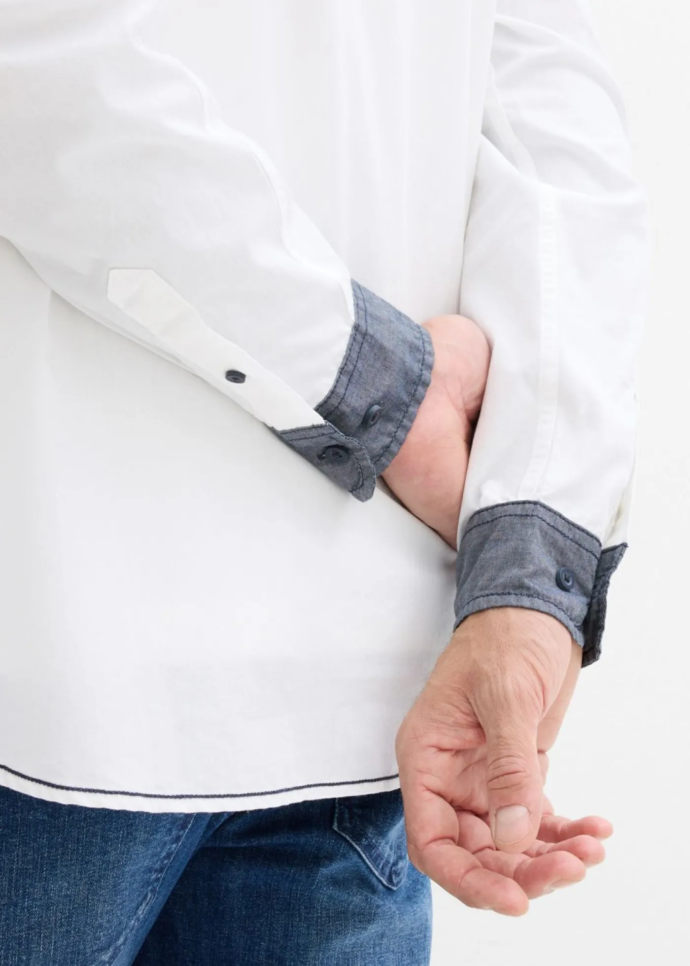 Camisa clásica con cuello Kent, dobladillo redondeado y bolsillos en el pecho. Los detalles en contraste de tejido chambray y los bordados en la parte delantera añaden un toque especial.