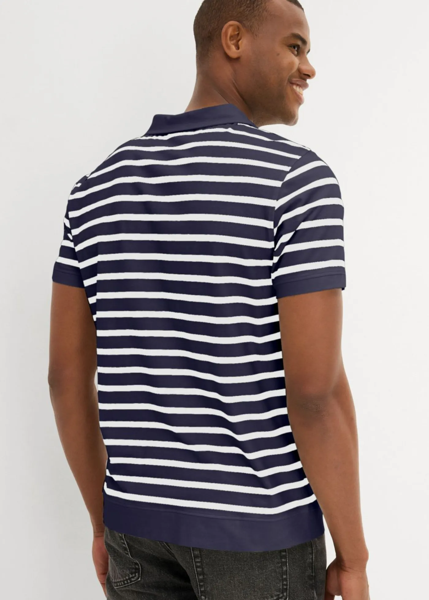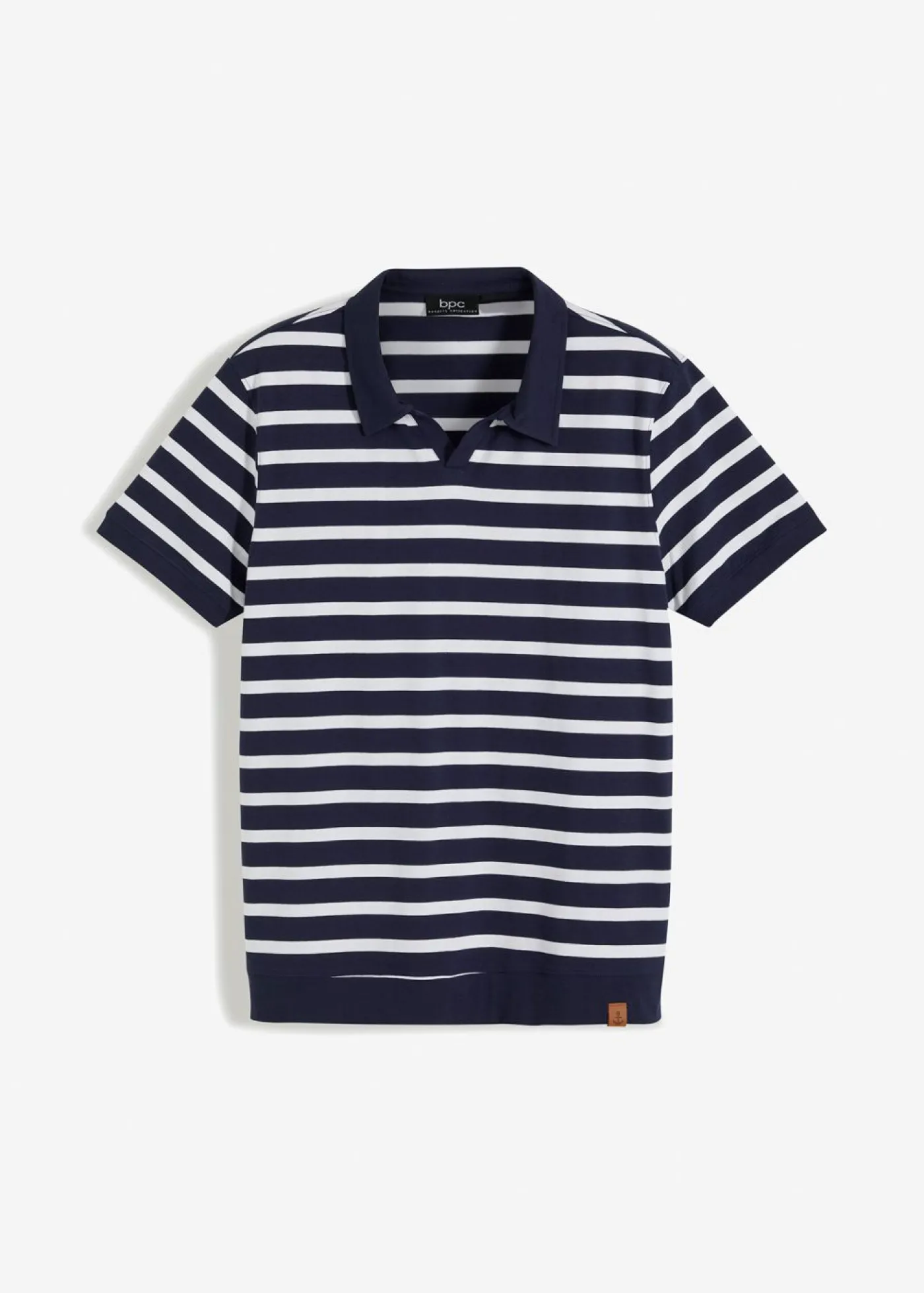 Polo moderno con puños y una pequeña etiqueta de piel sintética.