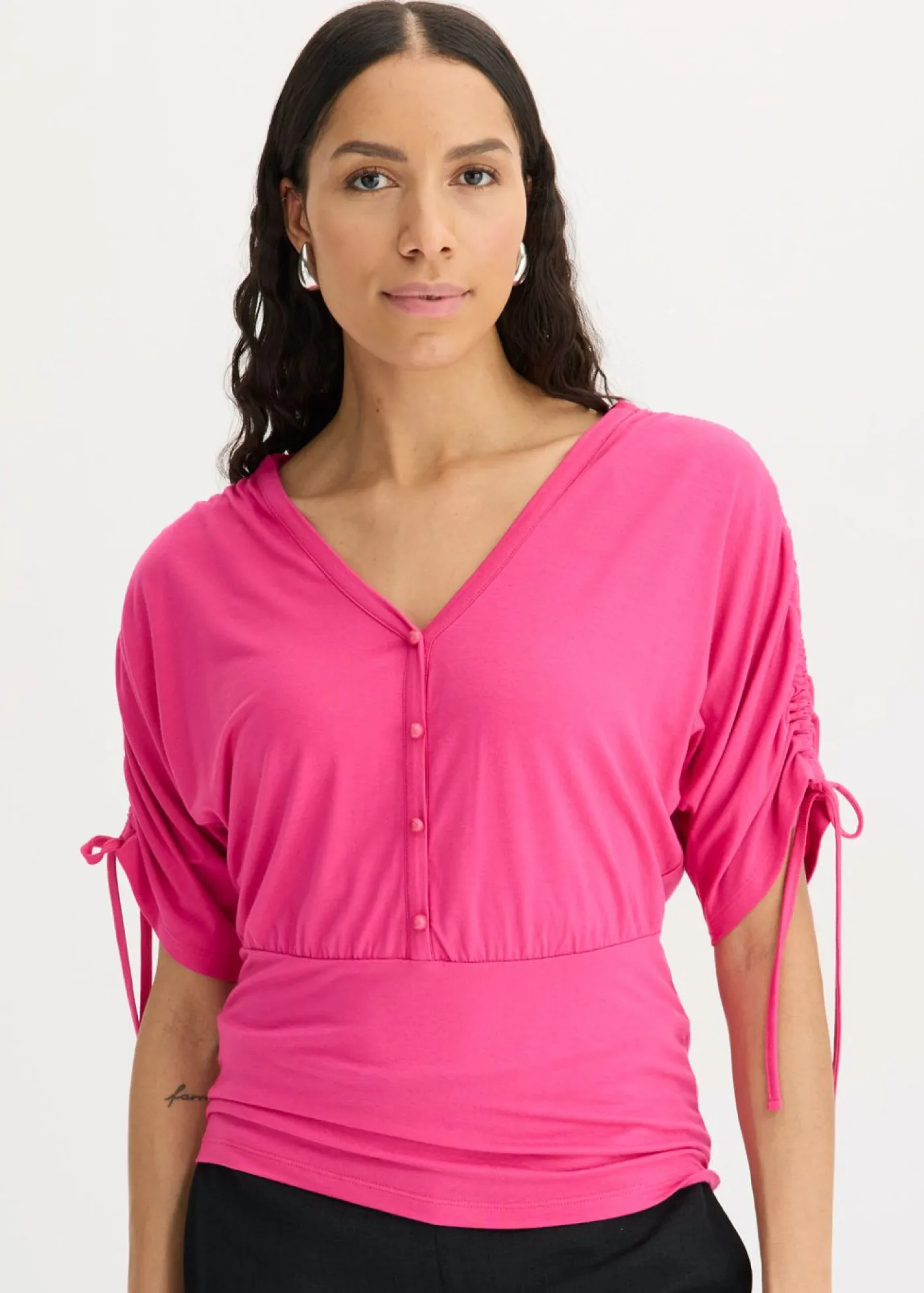 Camiseta femenina con botones decorativos.