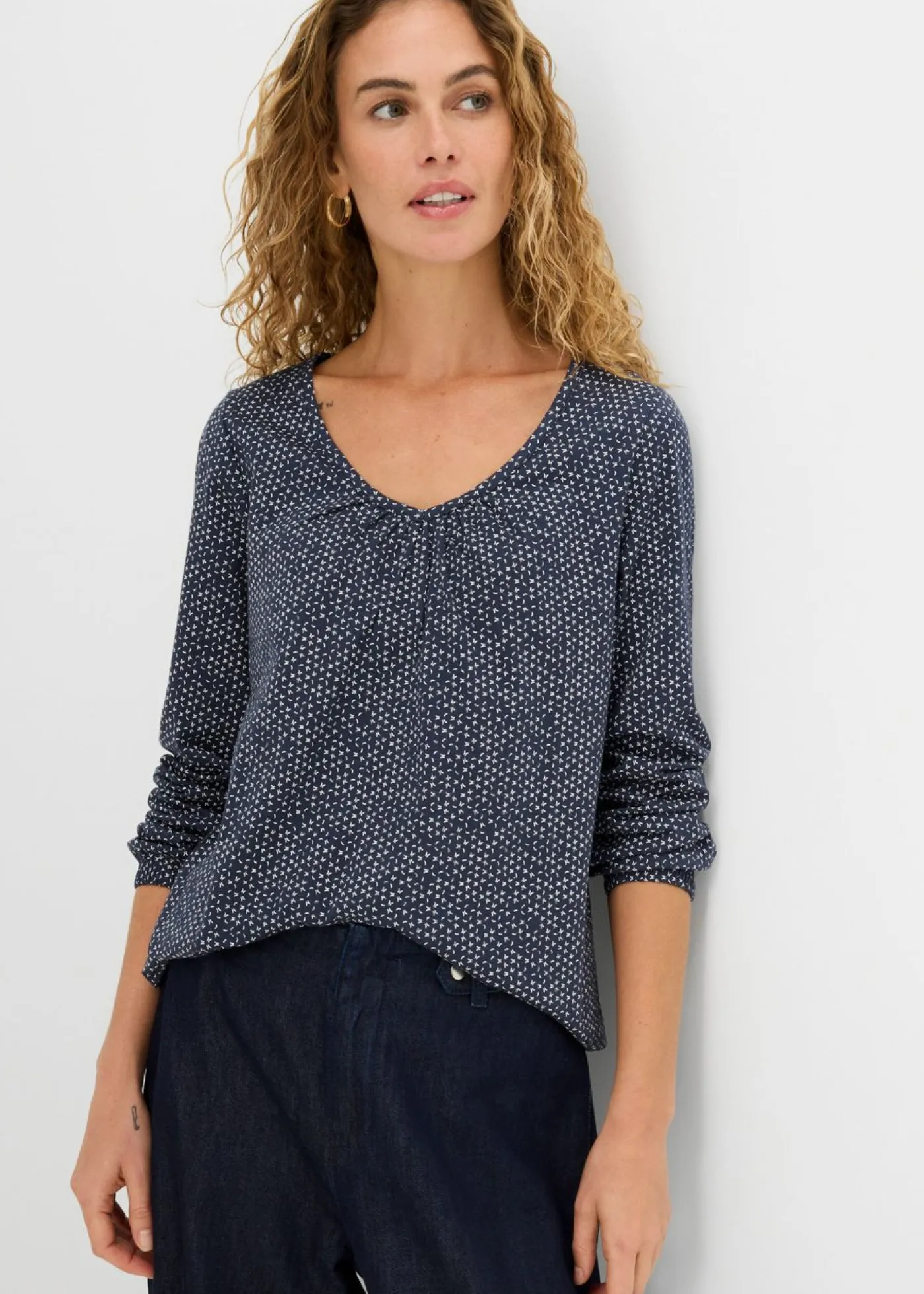 Cómoda camiseta de algodón con mangas largas y puños elásticos. Largo de aprox. 68 cm (talla 36/38) a 78 cm (talla 56/58). Se puede lavar a máquina.