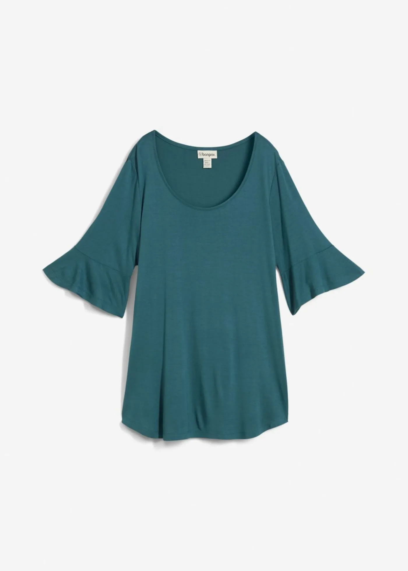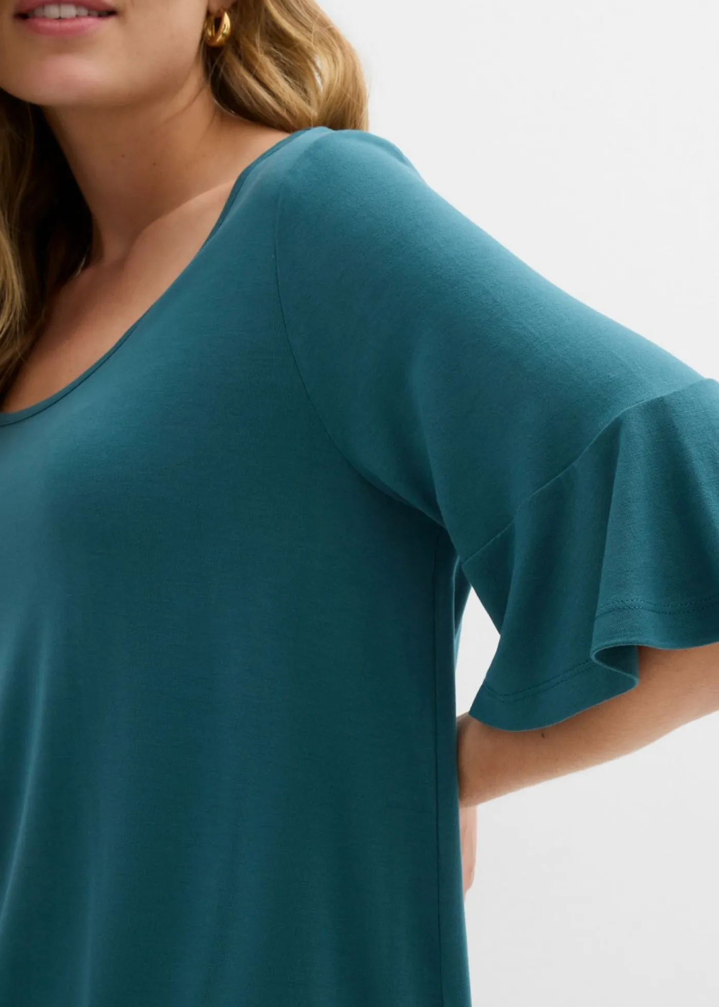 Camiseta de cuello redondo y corte en A. Con dobladillo redondeado y volantes en los puños. Largo de aprox. 74 cm en talla 40/42. Se puede lavar a máquina.