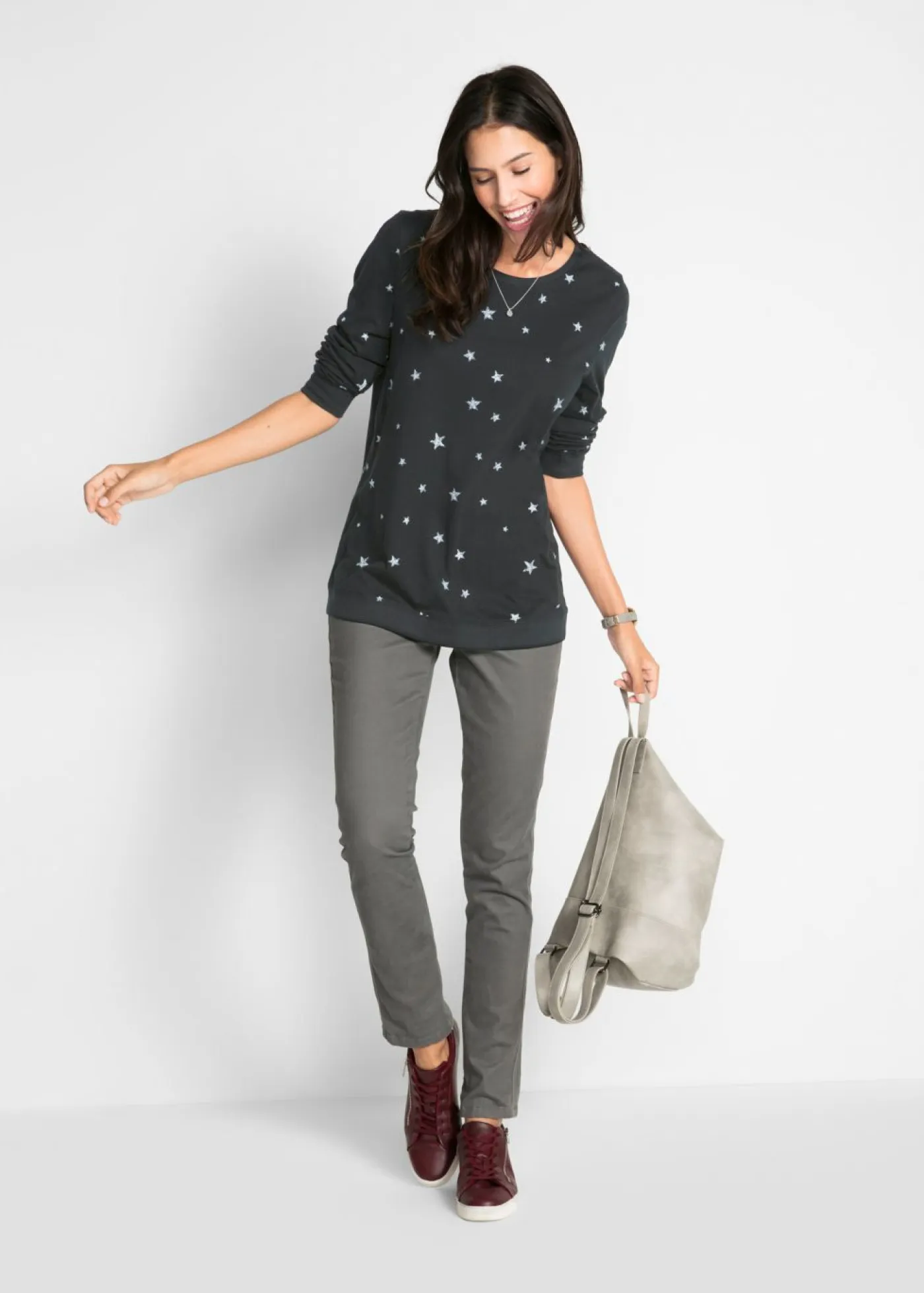 Cómoda camiseta de algodón de manga larga con cuello redondo. Largo de aprox. 68 cm (talla 36/38) a 78 cm (talla 56/58). Se puede lavar a máquina.