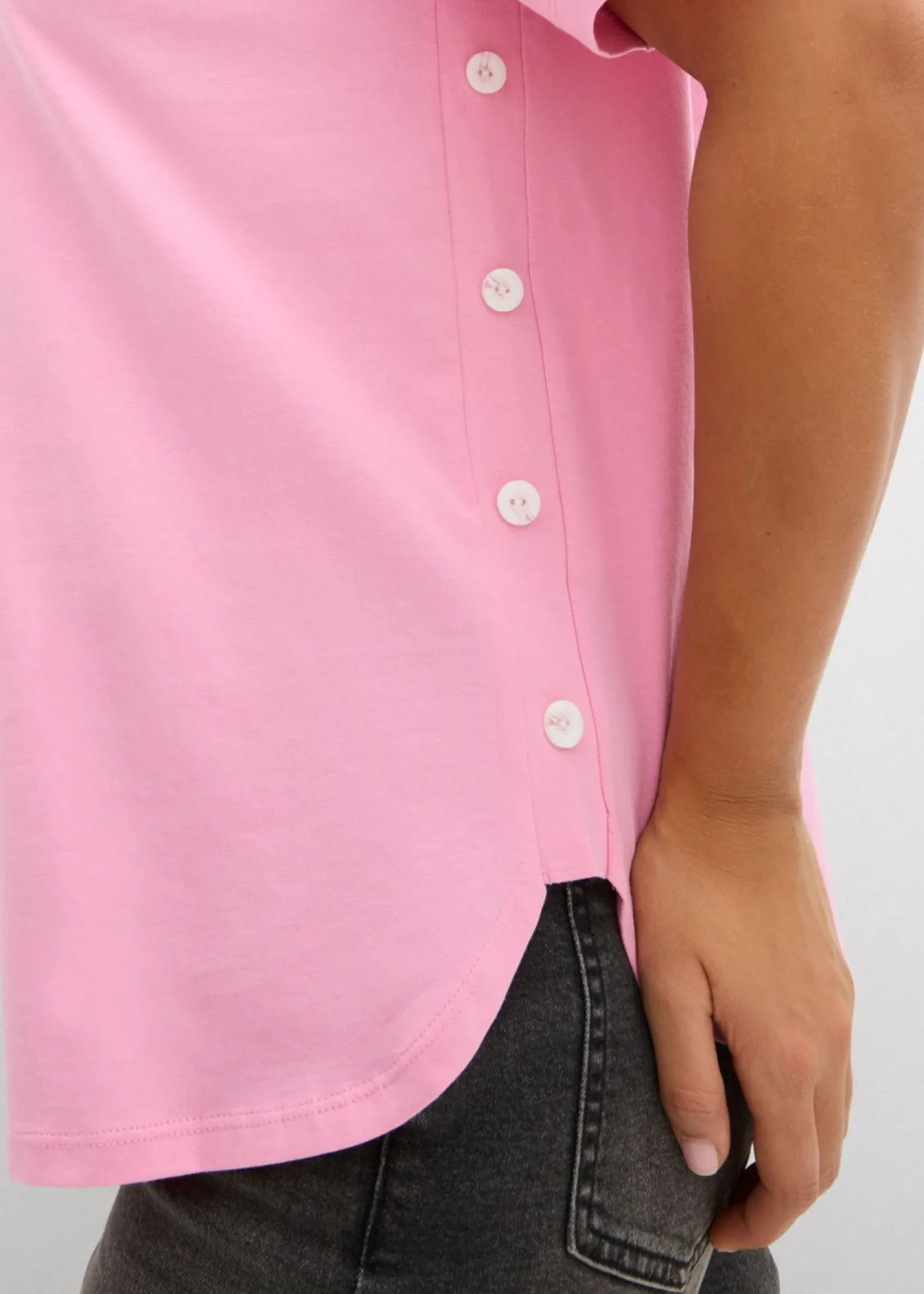 Camiseta con detalles de botones en los laterales de algodón orgánico con escote en V. Largo de aprox. 70 cm en talla 42. Se puede lavar a máquina.