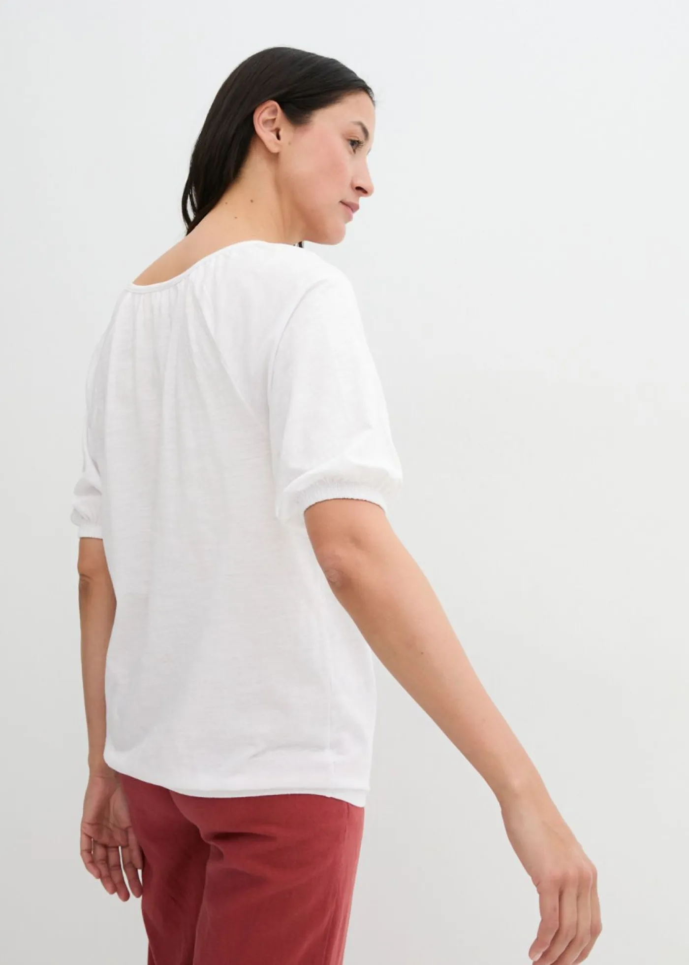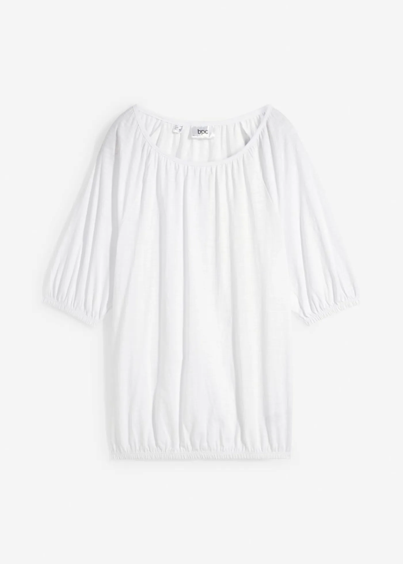 Camiseta de algodón orgánico puro con elástico cómodo en el bajo y las mangas. Largo de aprox. 70 cm en talla 42. Se puede lavar a máquina.