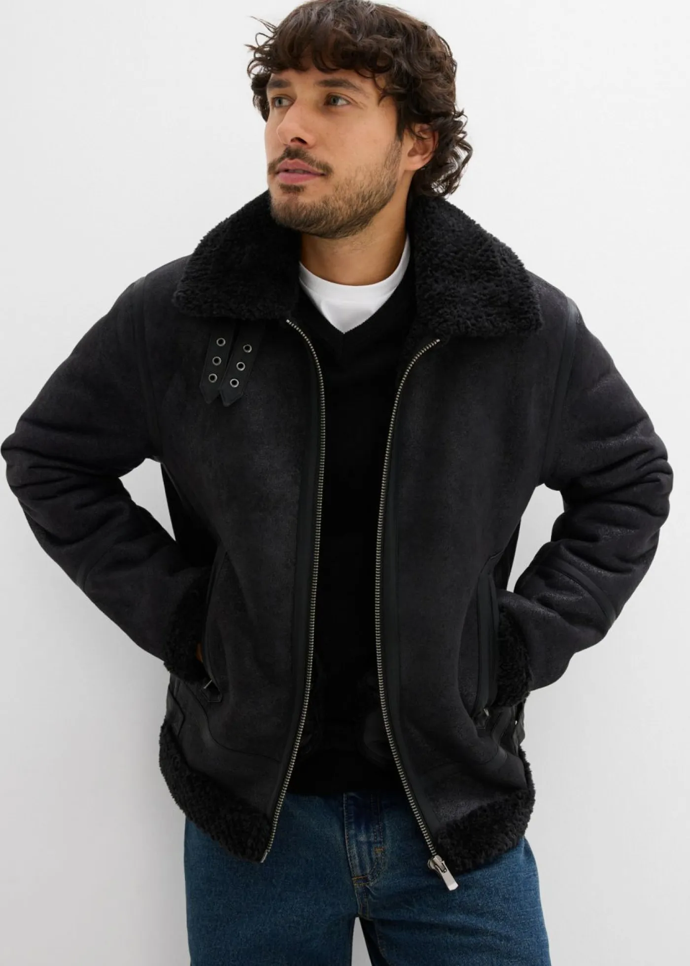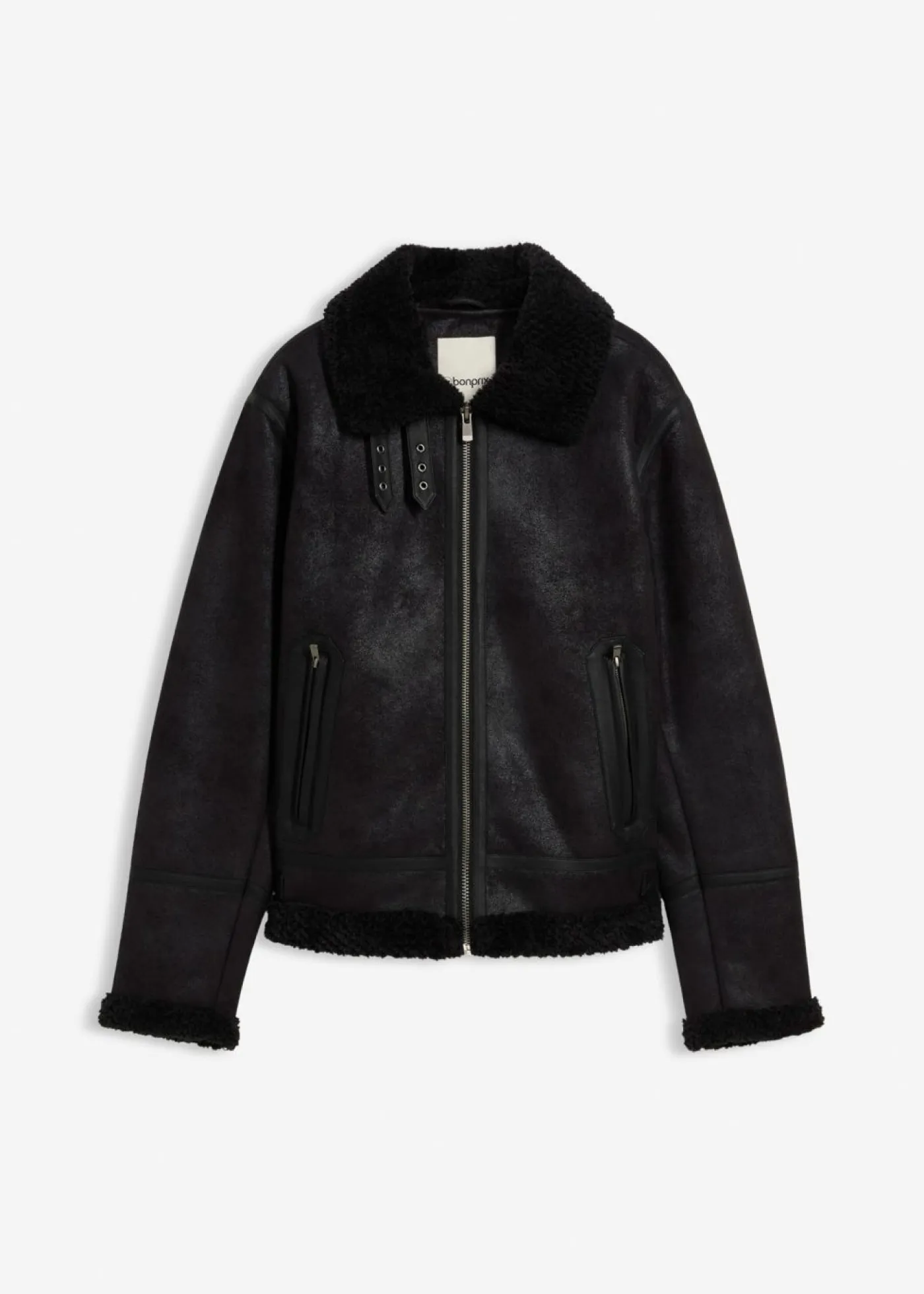 Chaqueta moderna de piel sintética con forro polar. Con apertura de cremallera.