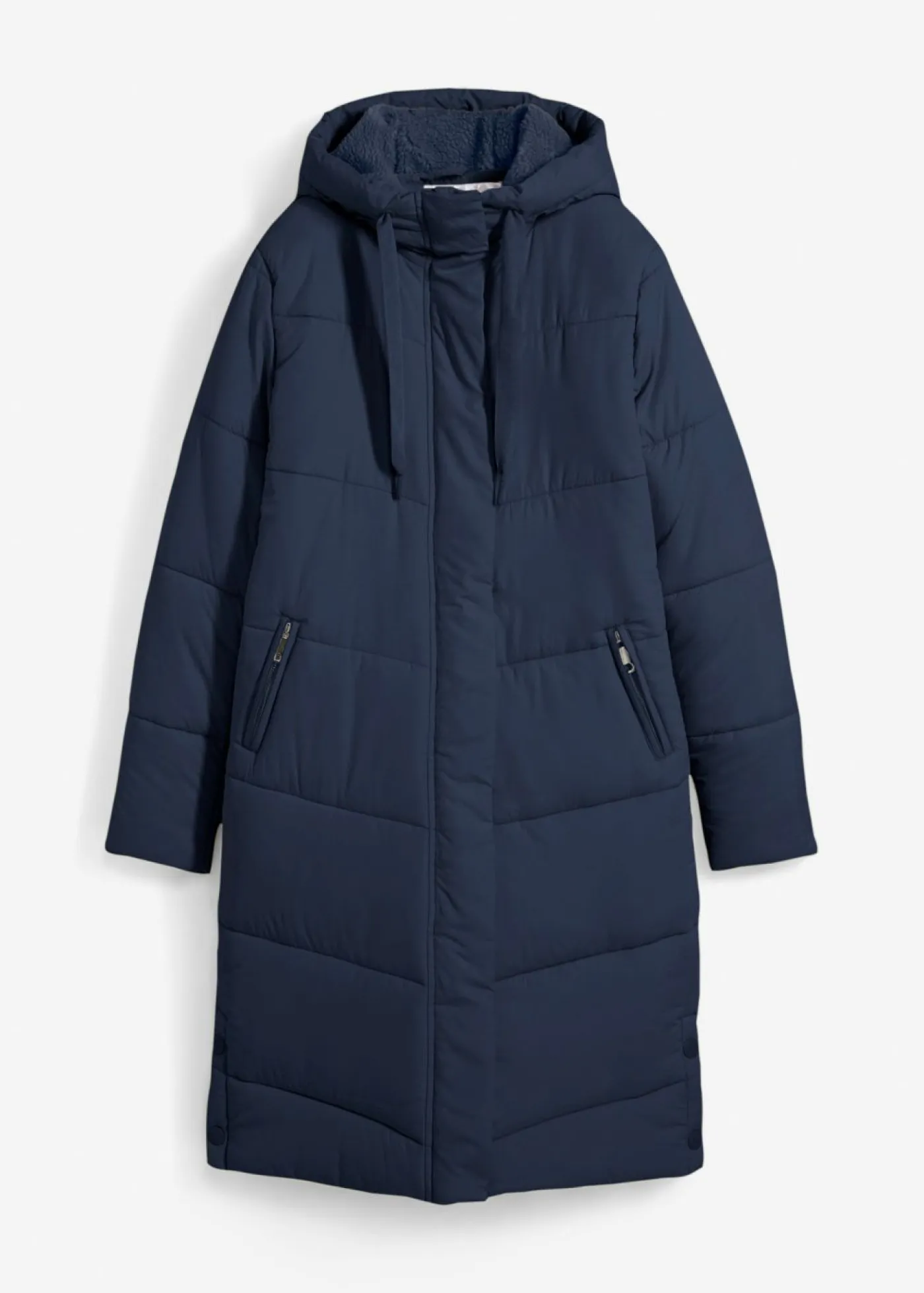 Moderno abrigo acolchado con capucha y forro polar.