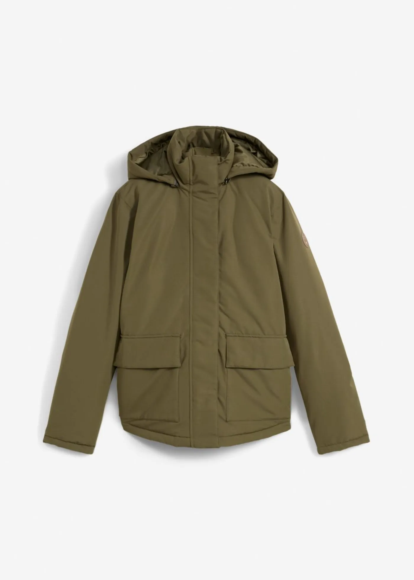 Chaqueta de invierno informal con capucha y grandes bolsillos.