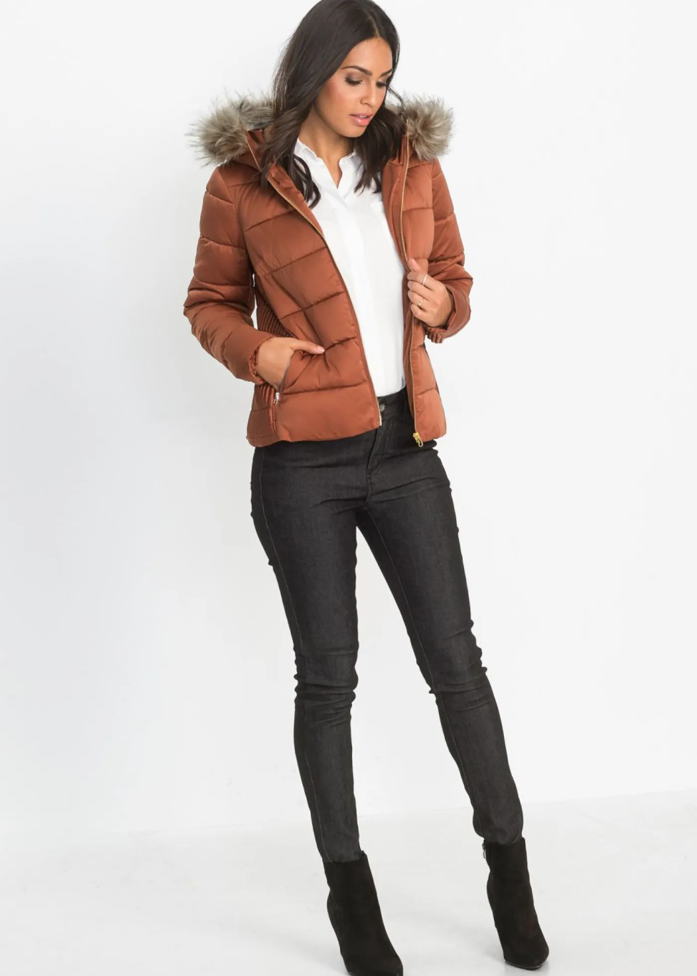 Chaqueta acolchada femenina con capucha de piel sintética y fruncidos. Esta ligera chaqueta acolchada con capucha tiene un cuello de piel sintética y cremallera metalizada. Al ser entallada, acentúa la figura. Con fruncidos en la cintura y a lo largo de las mangas. Largo de aprox. 59 cm en talla 38.