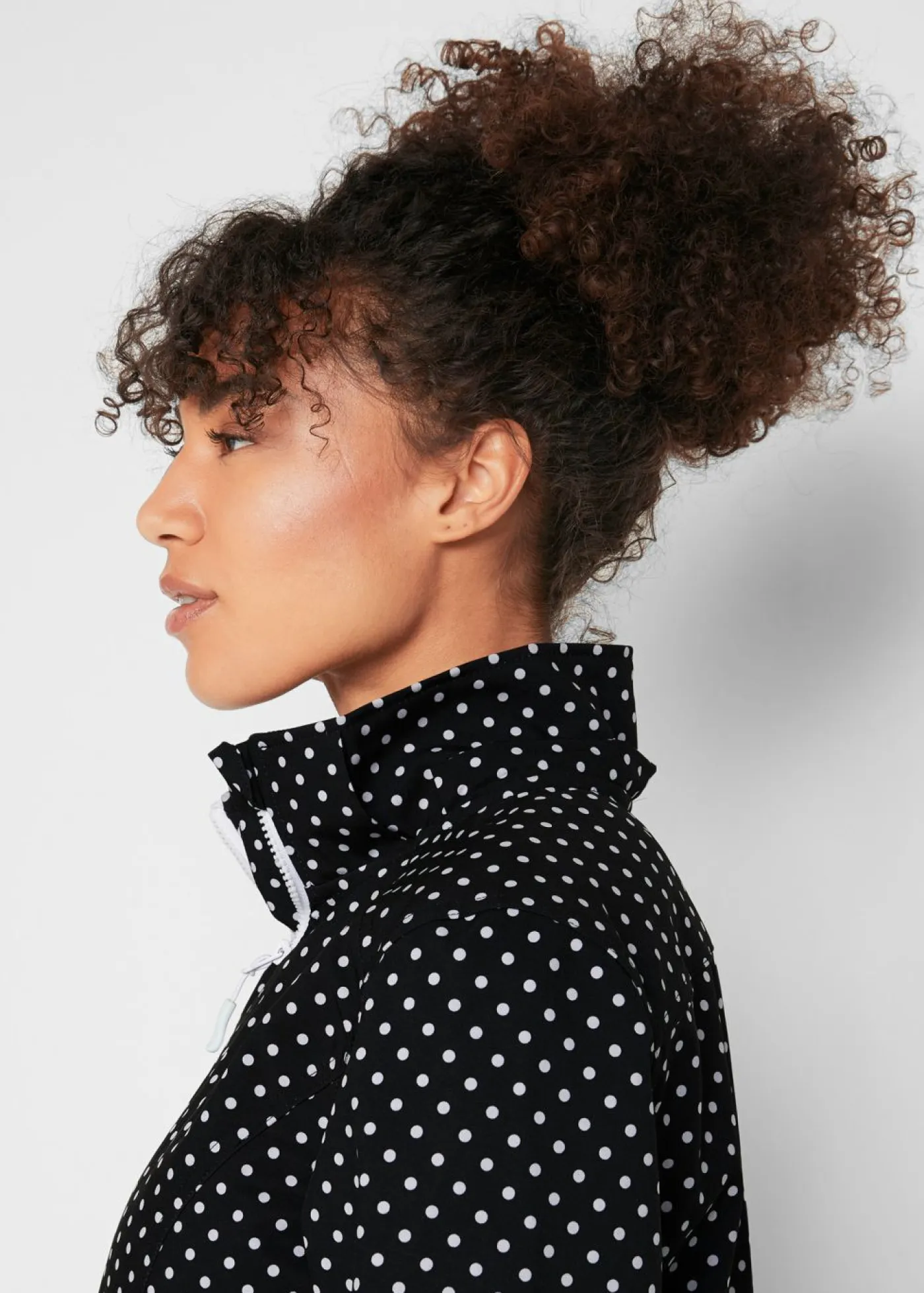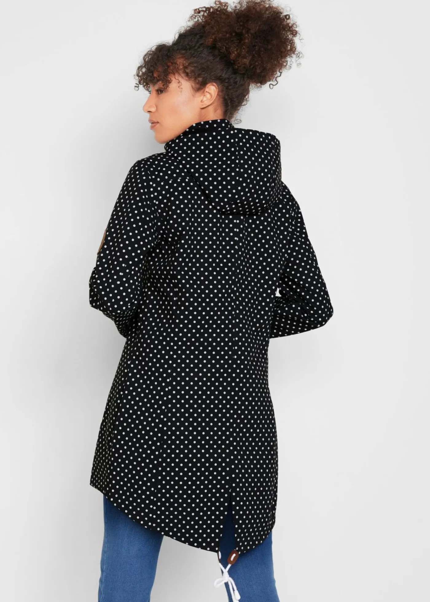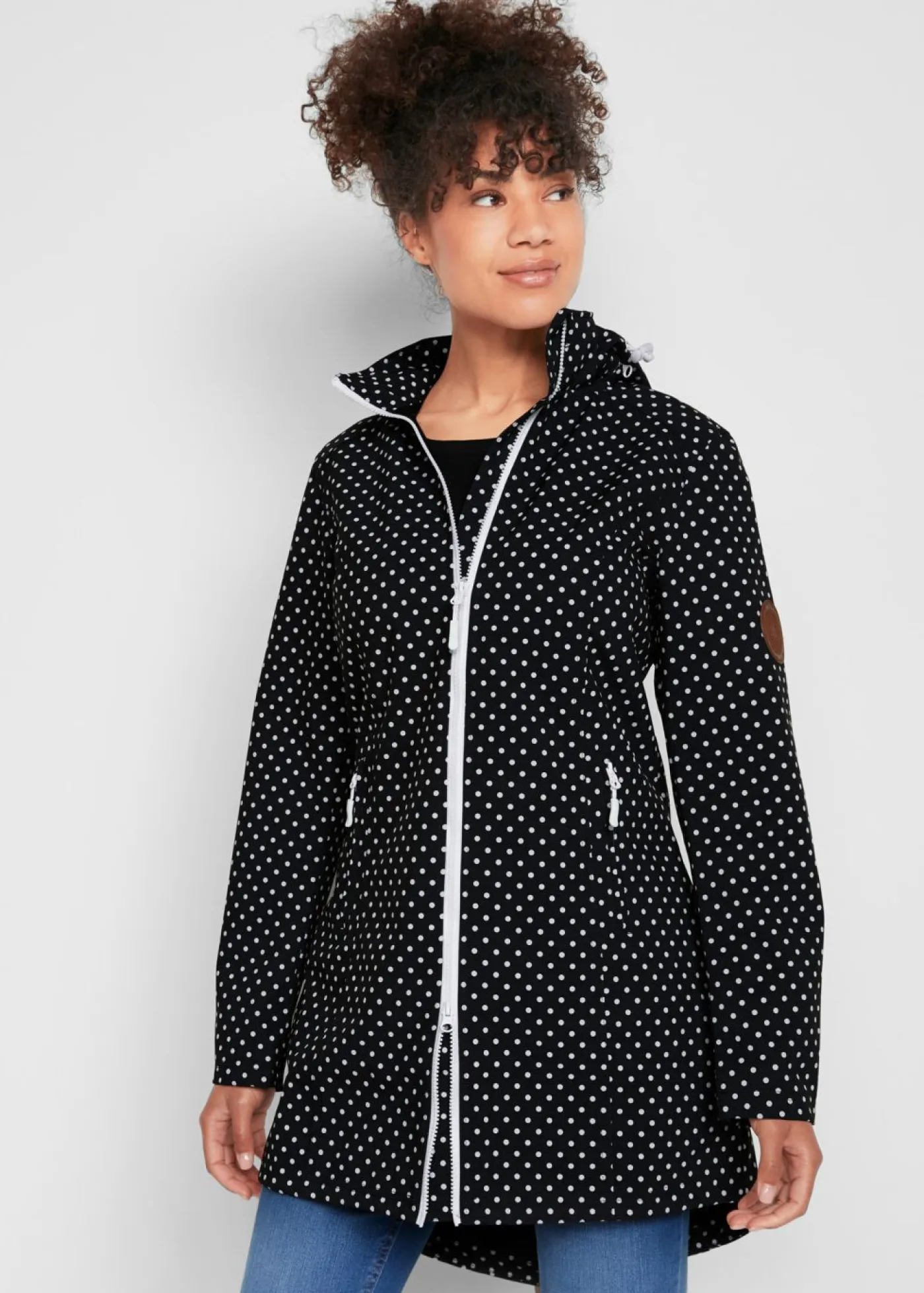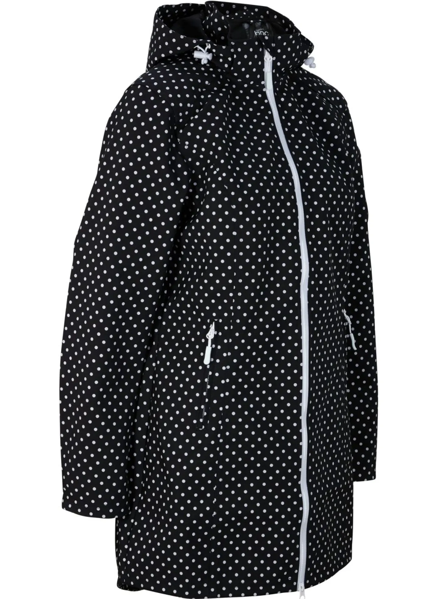 Cómoda chaqueta larga de tejido Softshell con capucha elástica y desmontable. Capucha desmontable, cremallera de 2 vías con protección para la barbilla, inserto elástico en la parte trasera, chaqueta con rugosidad marcada en el interior. Largo de aprox. 90 cm en talla 42.