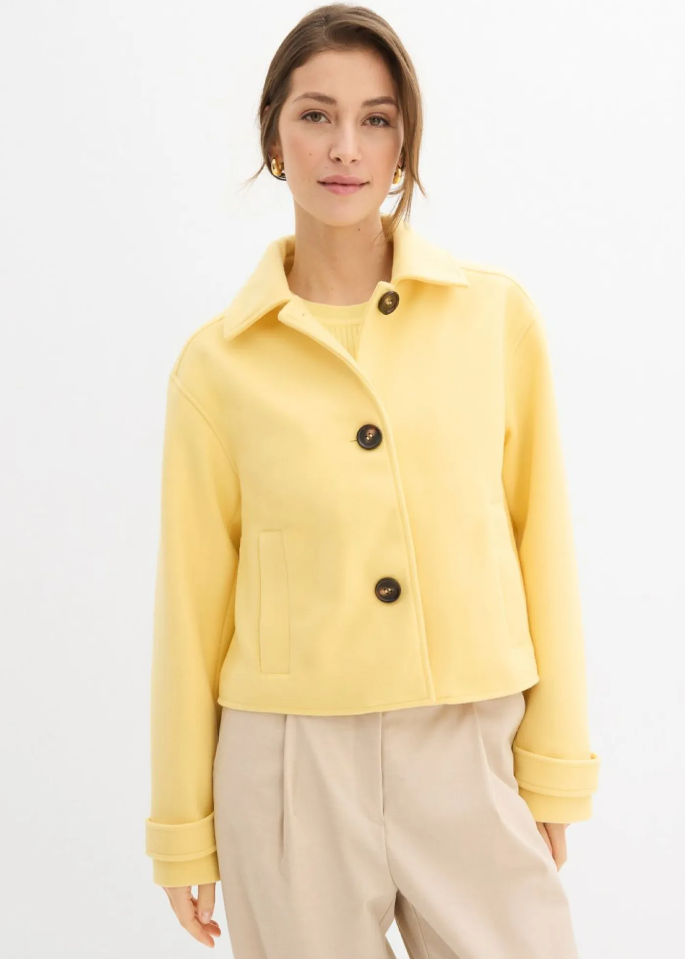 Elegante abrigo corto con aspecto de lana y bolsillos.