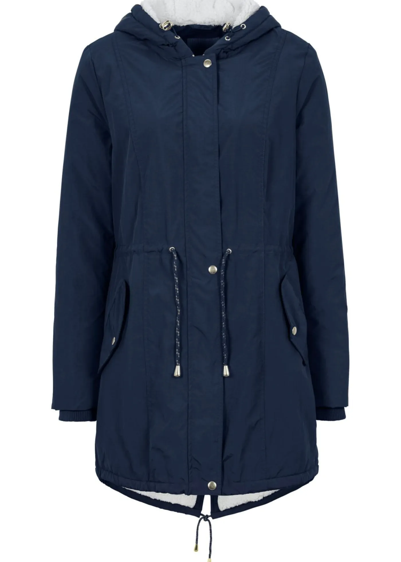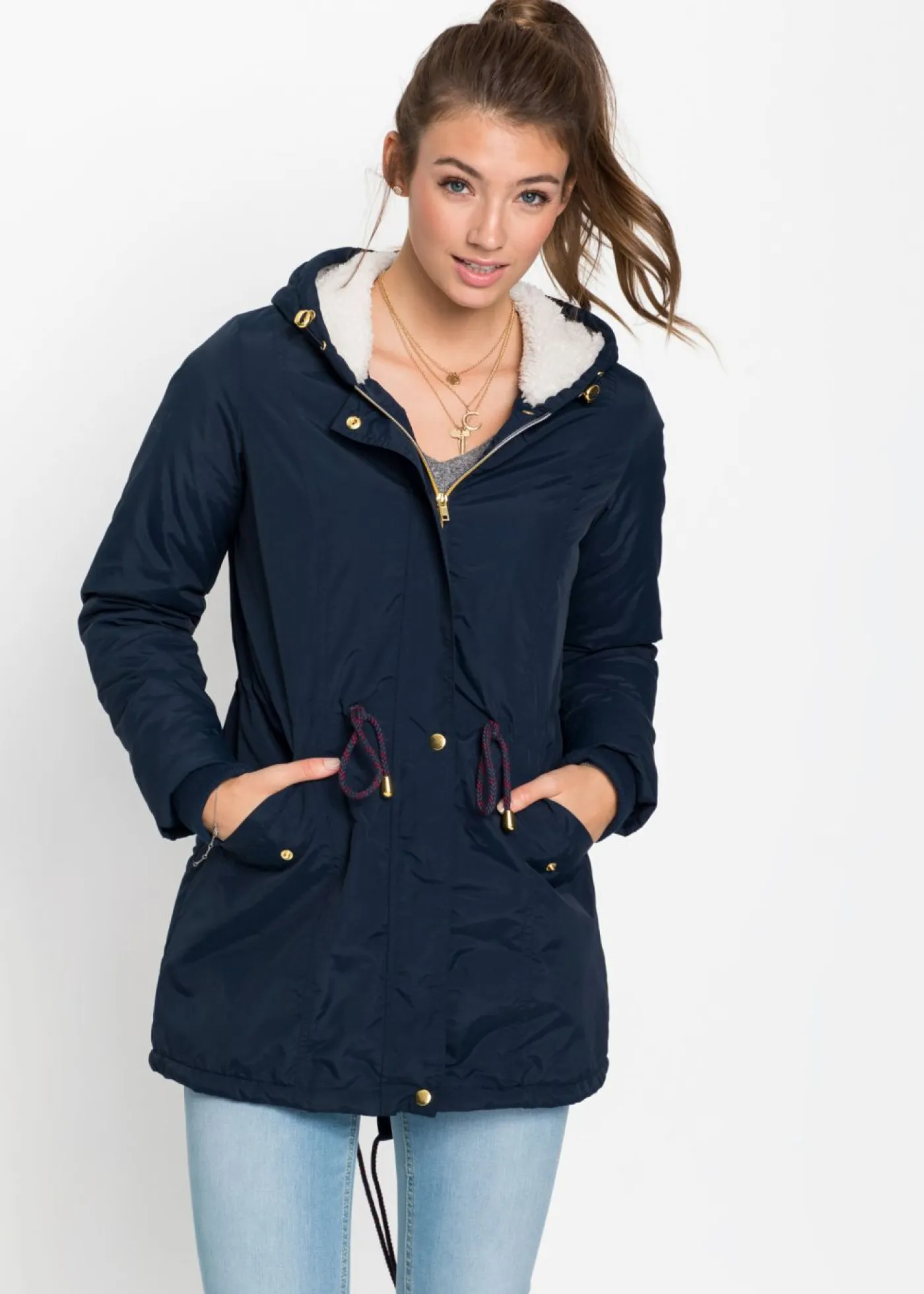 Un abrigo para cuando hace frío con un forro polar y capucha con más forro polar por dentro. LLeva bolsillos con tapa en los lados y un cordón de ajuste en el bajo. Lavable a máquina. Largo aproximado 90 cm.