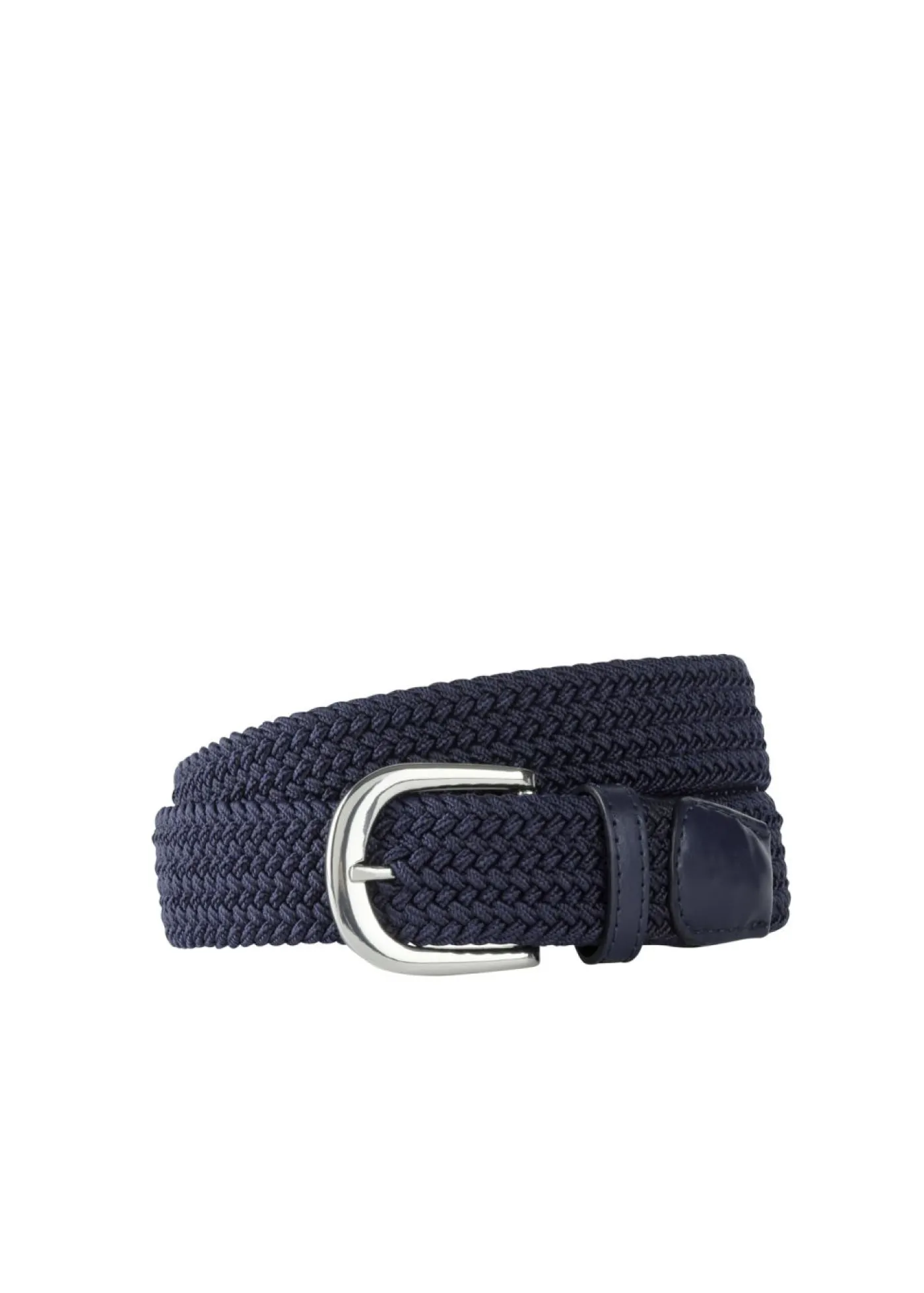 Cinturón elástico con aspecto trenzado en azul marino. Cinturón elástico elegante con aspecto trenzado y hebilla plateada. Muy fácil de combinar.