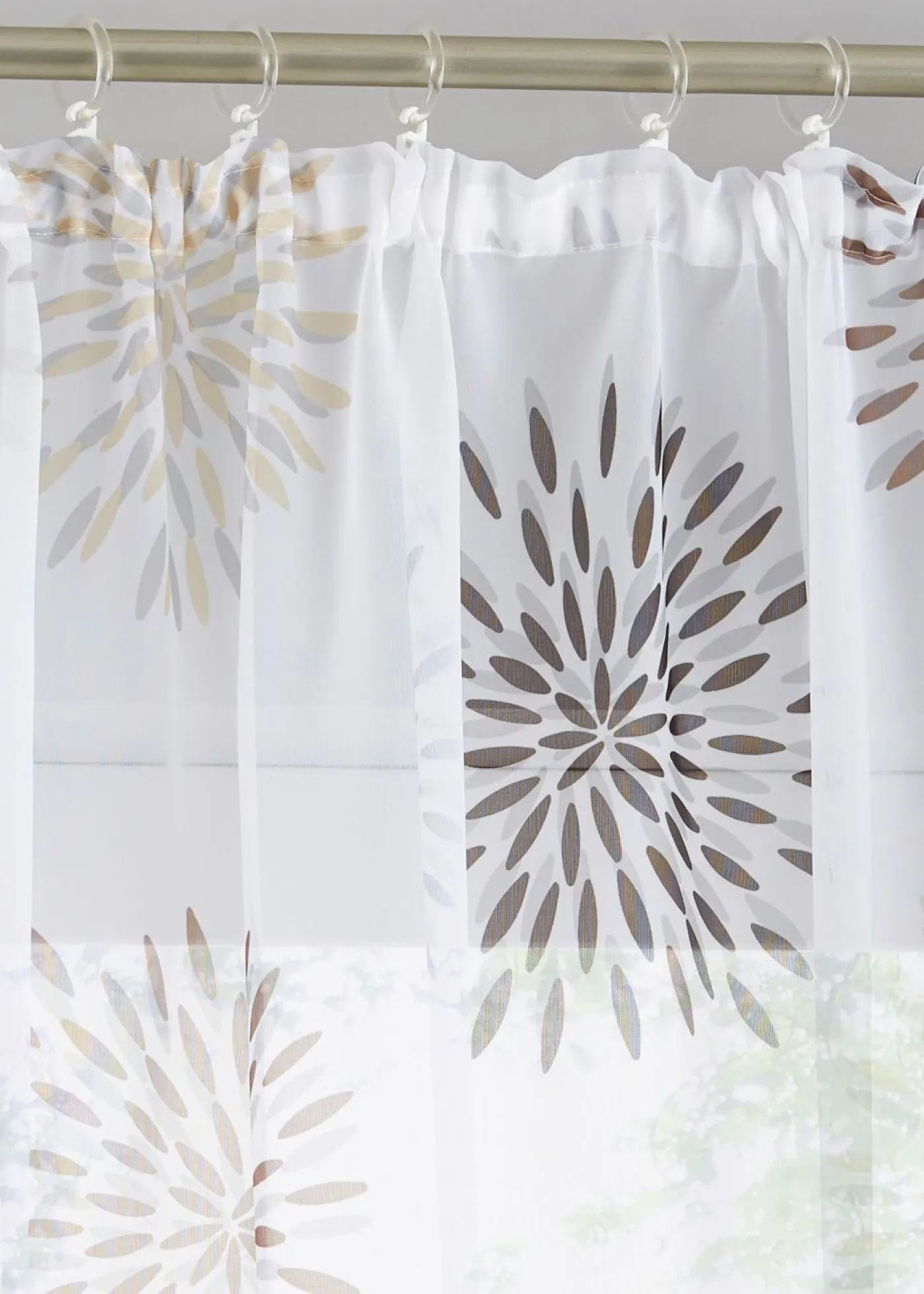 Estampado moderno sobre cortina transparente. Ligera y moderna al mismo tiempo: nuestra cortina transparente de gasa fina de calidad destaca el estilo moderno de la decoración con sus llamativos motivos circulares.