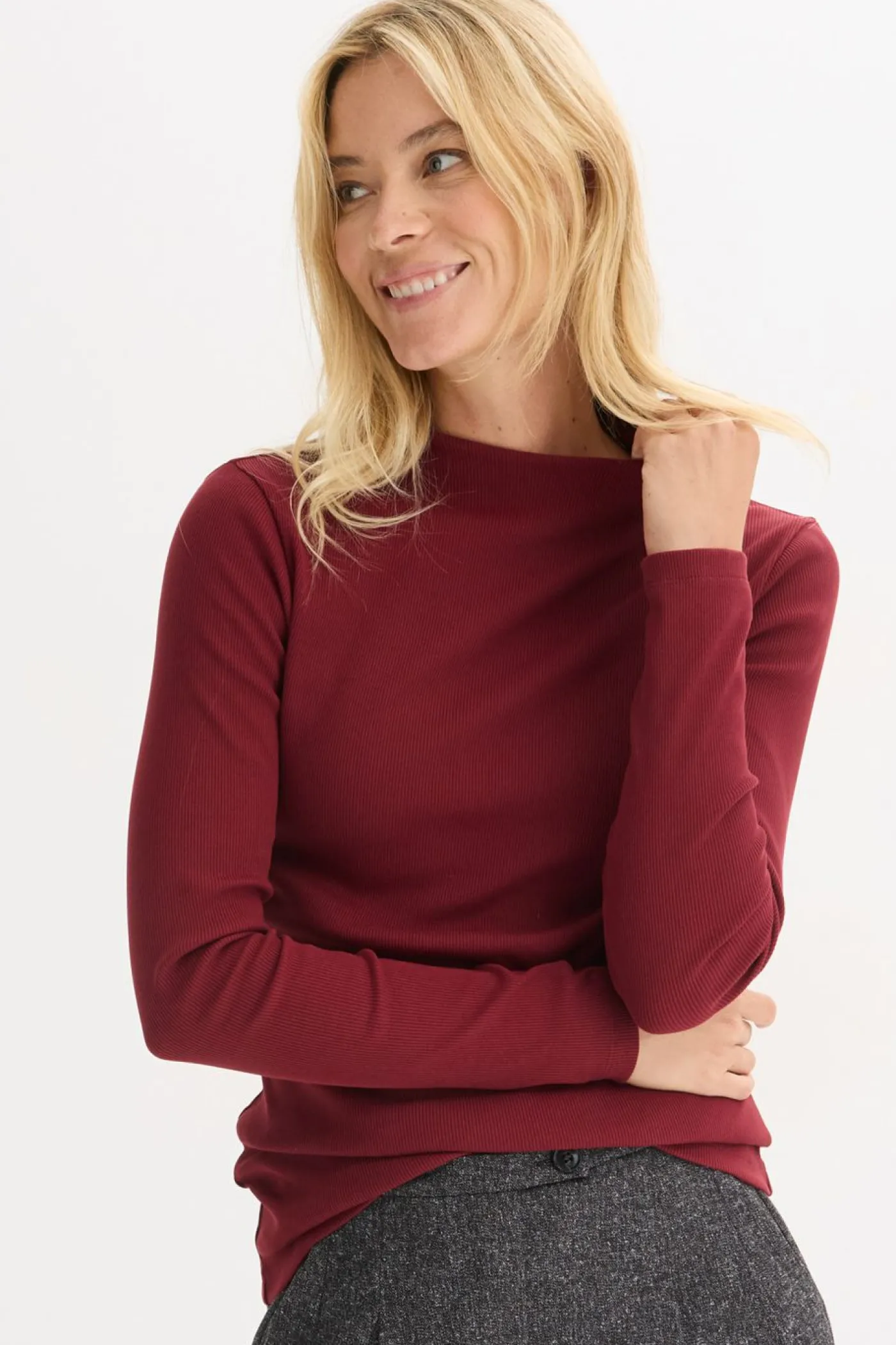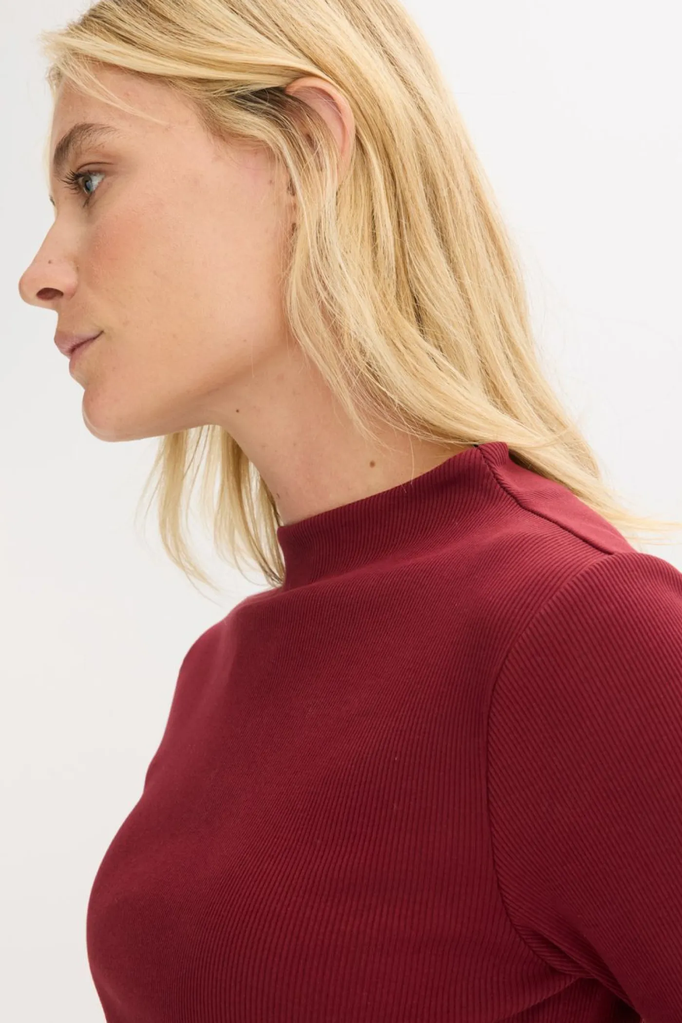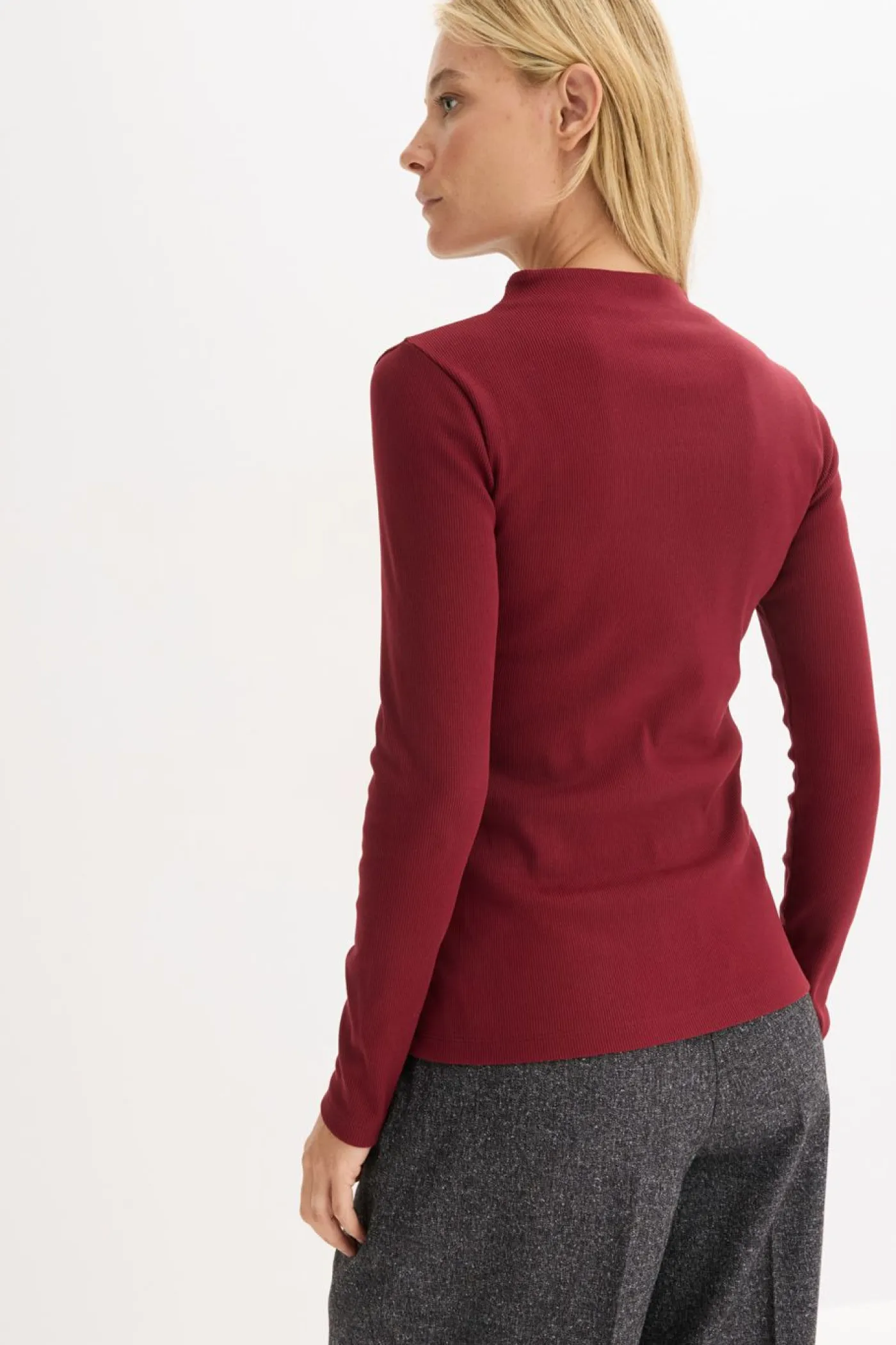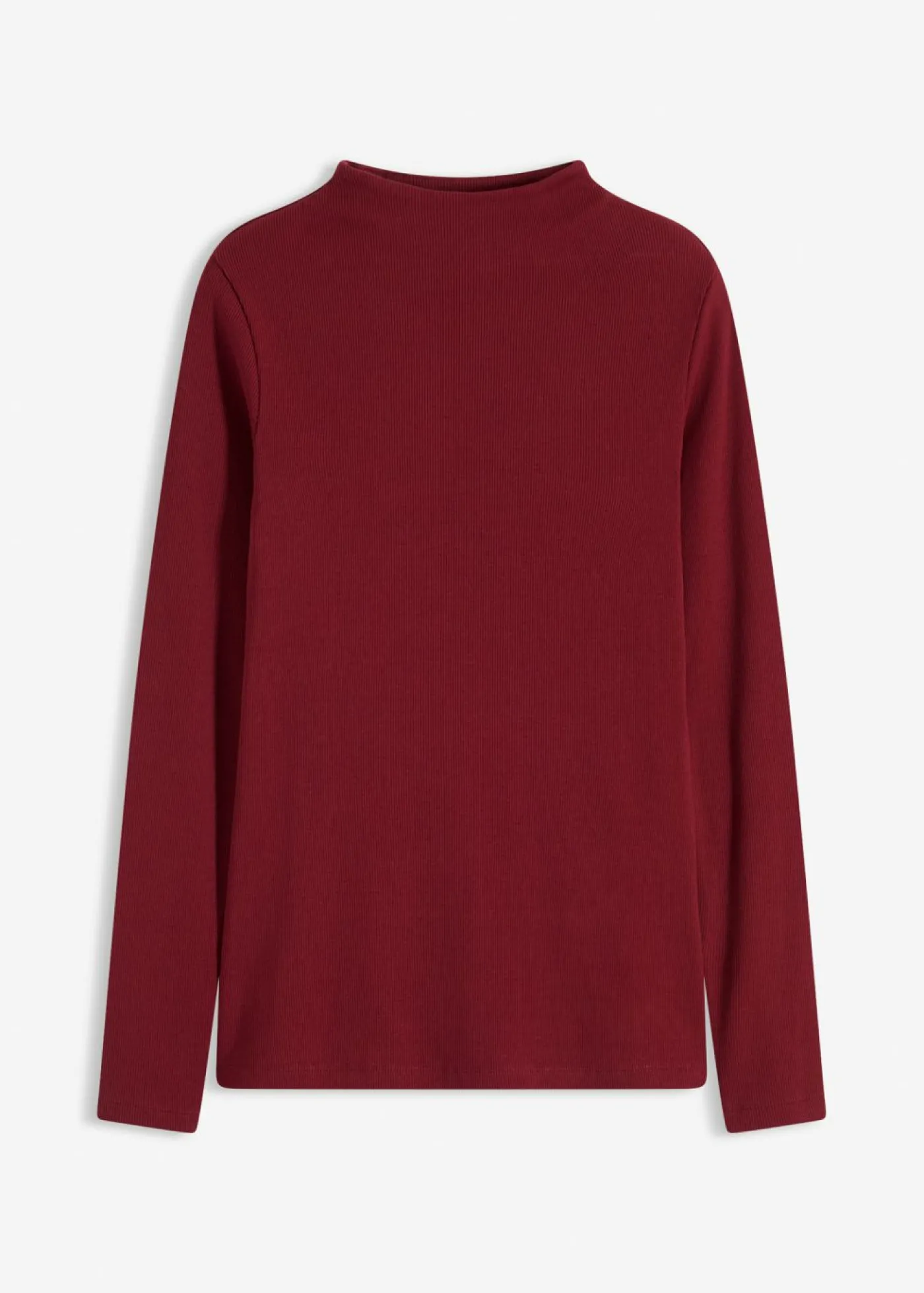 Camiseta ajustada de canalé con cuello alto y mangas largas.