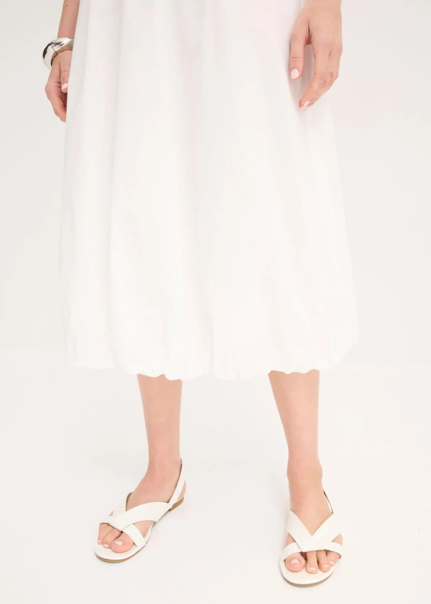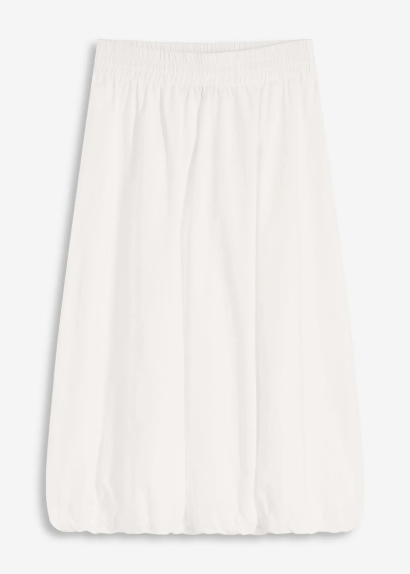 Falda larga con bajo abullonado, cinturilla elástica y bolsillos en la costura lateral.