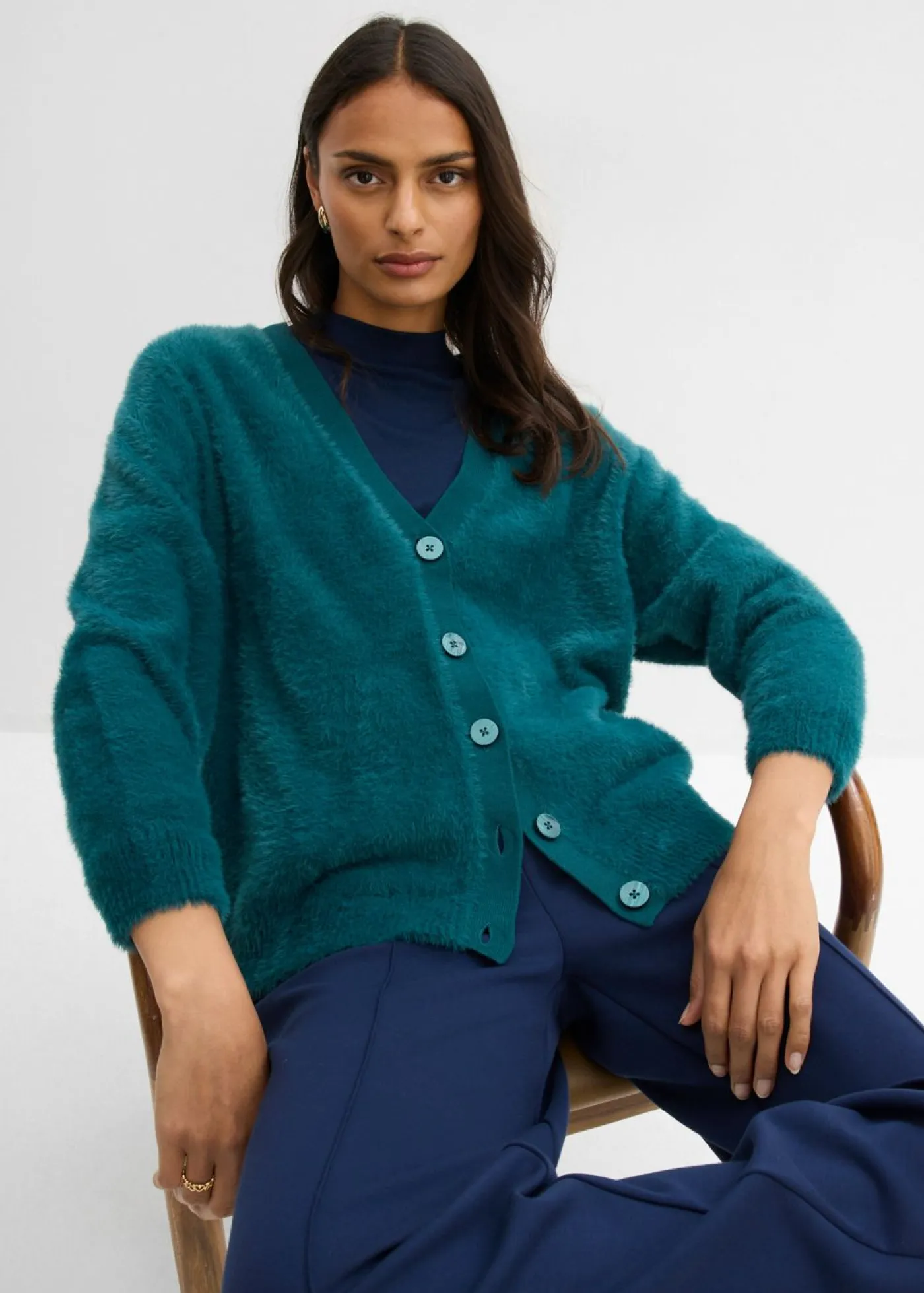 Chaqueta de punto de manga larga de hilo de suave con cierre de botones en la parte delantera.
