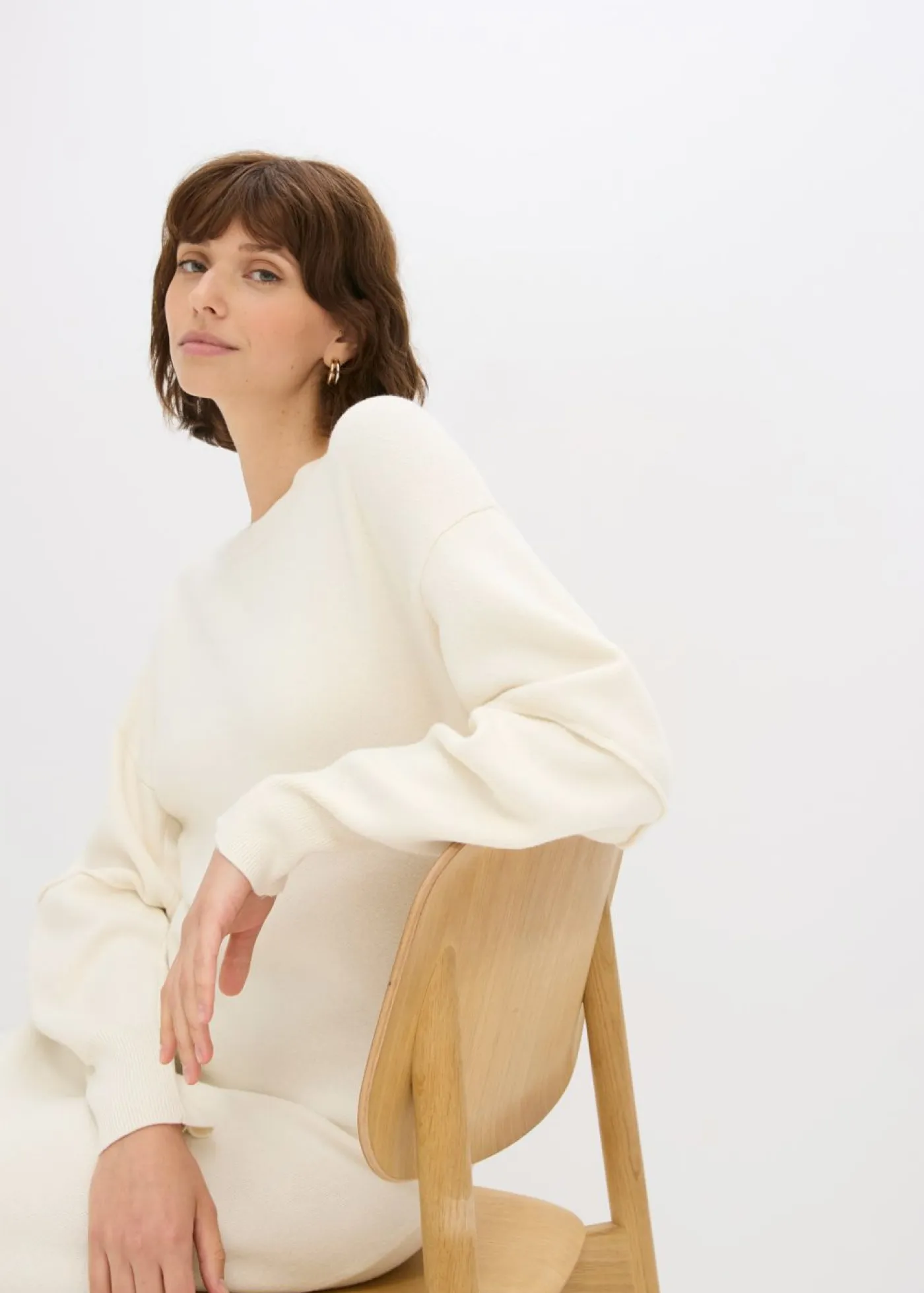 Vestido midi entallado de punto con mangas voluminosas y corte regular.