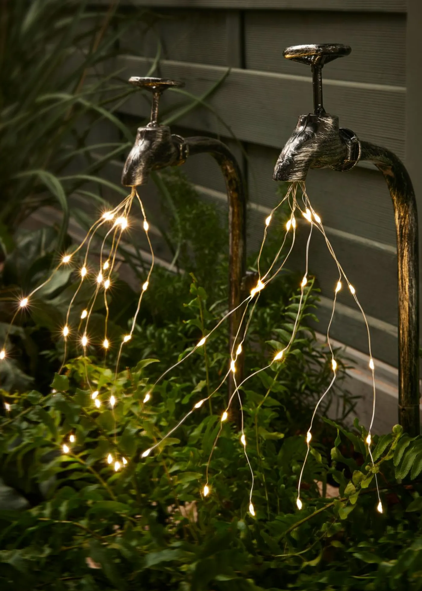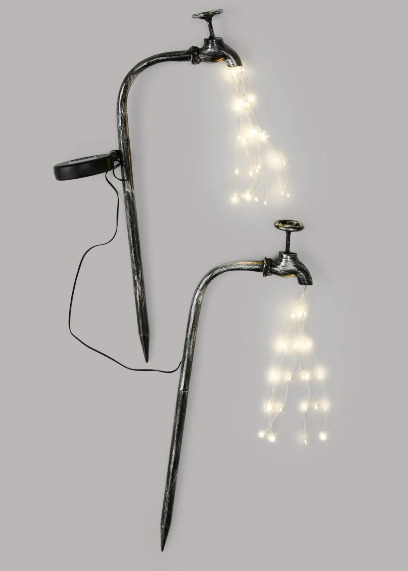 Original iluminación para el jardín, la terraza o el balcón: 2 grifos con 30 ledes cada uno. Con sensor de oscuridad, al anochecer, las 60 luces LED de color blanco cálido se encienden automáticamente y duran hasta 8 horas. Incluye 1 batería AA Ni-Mh de 400m Ah. Con interruptor de encendido/apagado.