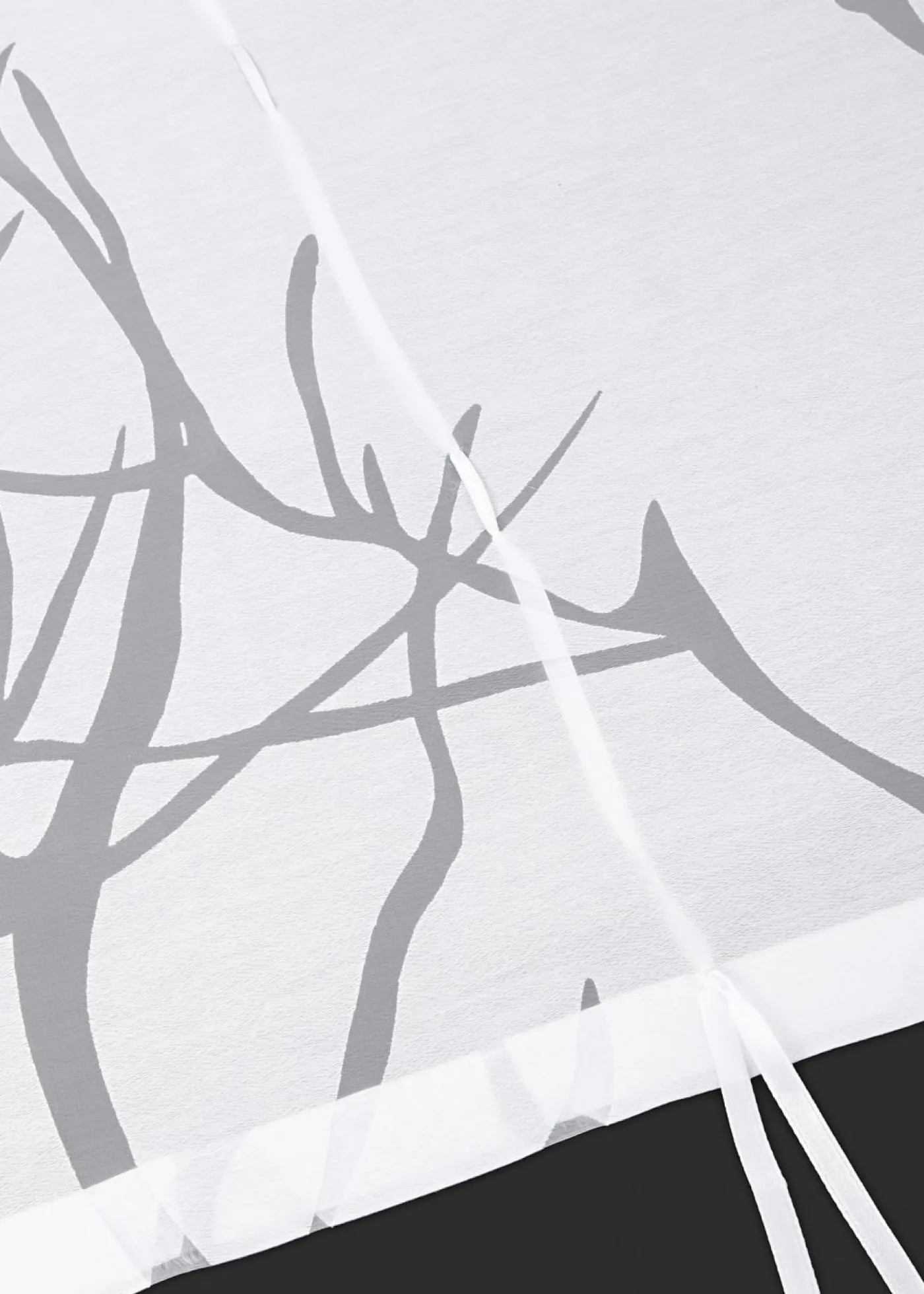 Bonita cortina en tejido devoré con elaborada decoración. Se sujeta anudando los cordones a la altura deseada. Con dobladillo para introducir una barra de entre 3,5 y 4 cm. Las medidas son las de la tela. Lavable.